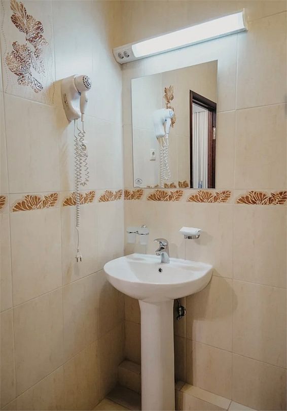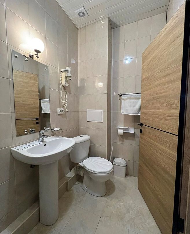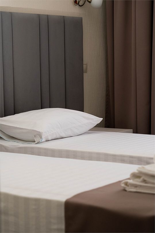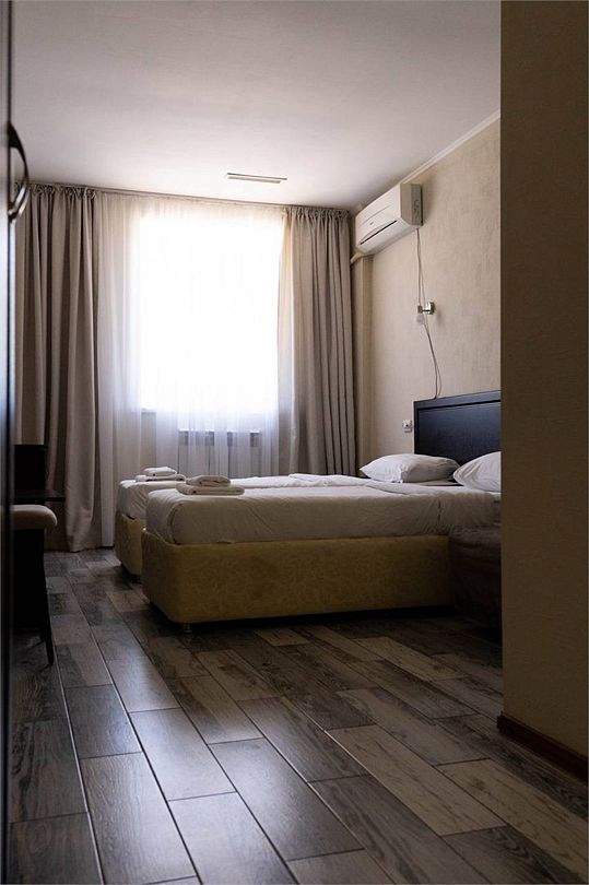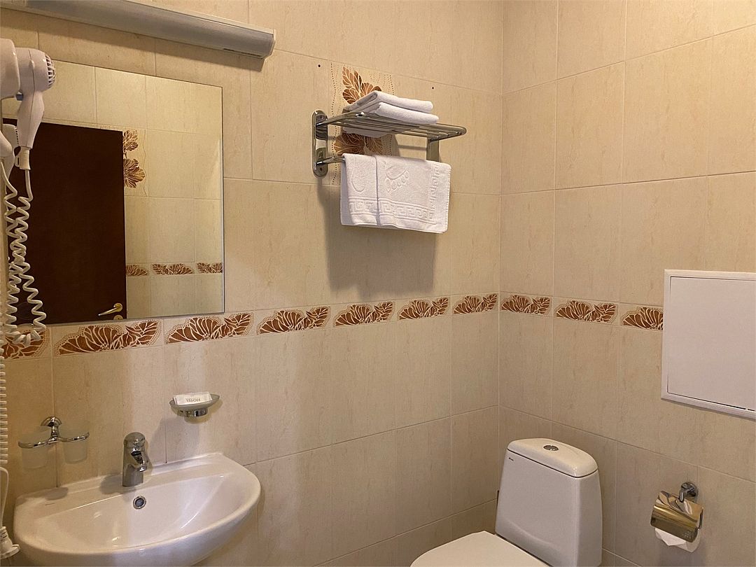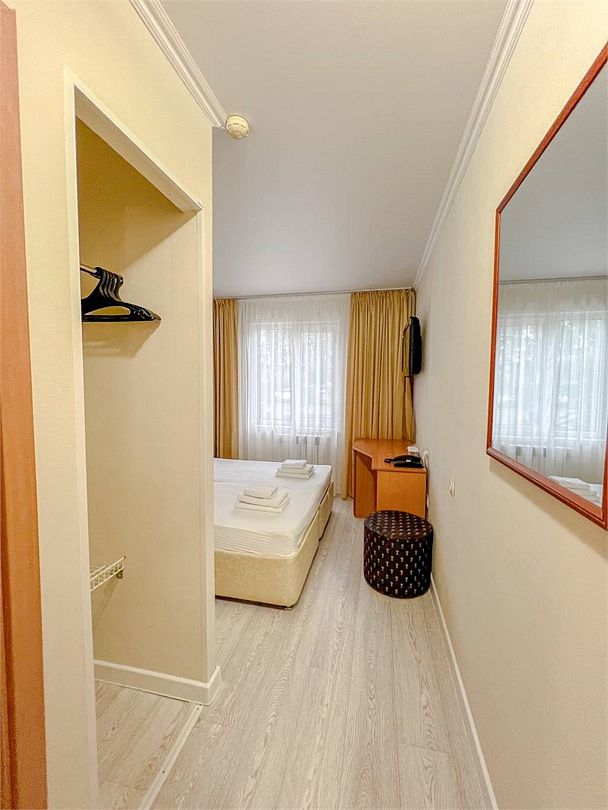 В номере — двуспальная или 2 раздельные кровати, 2 прикроватные тумбочки, столик с зеркалом, шкаф для одежды, сплит-система, телефон, телевизор, мини холодильник, фен, санузел, предусмотрено дополнительное место (одноместный диван), балкон, сушилка для белья, полотенце, мыло/шампунь.