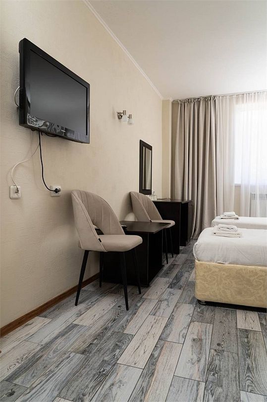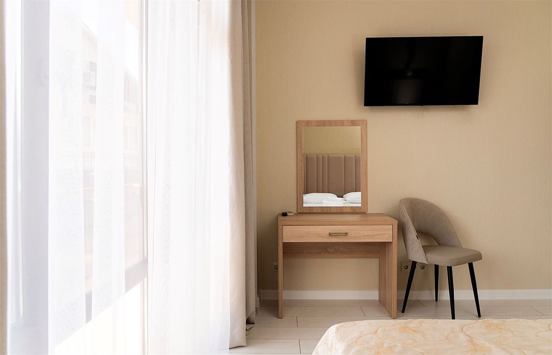 В номере — двуспальная или 2 раздельные кровати, 2 прикроватные тумбочки, столик с зеркалом, шкаф для одежды, сплит-система, телефон, телевизор, мини холодильник, фен, санузел, полотенце, мыло/шампунь, предусмотрено дополнительное место (одноместный диван), балкон, сушилка для белья, стулья.