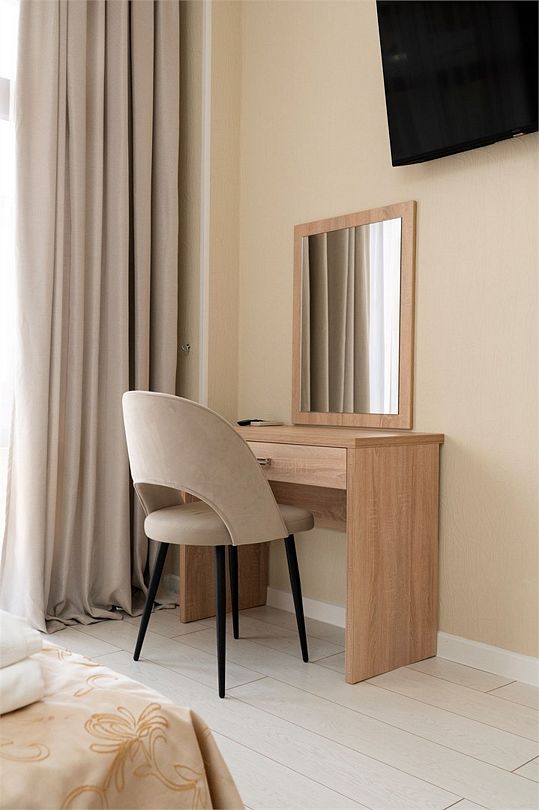 В номере — двуспальная или 2 раздельные кровати, 2 прикроватные тумбочки, столик с зеркалом, шкаф для одежды, сплит-система, телефон, телевизор, мини холодильник, фен, санузел, полотенце, мыло/шампунь, балкон, сушилка для белья, стулья.