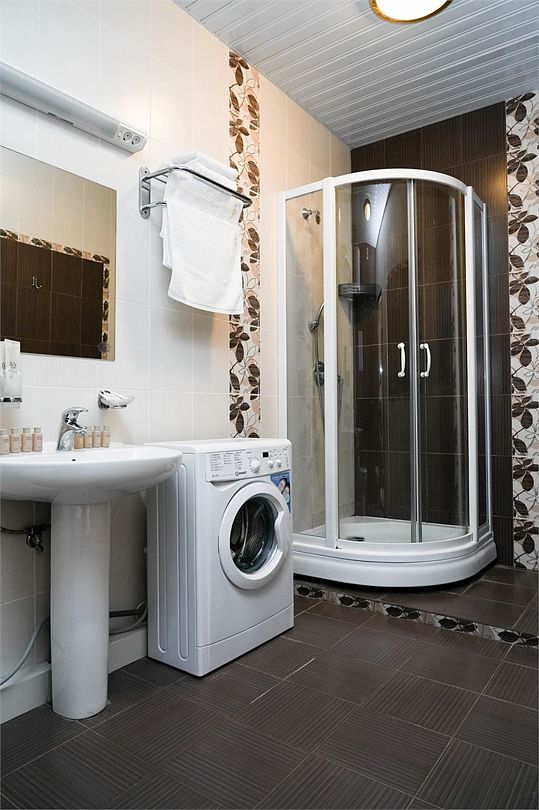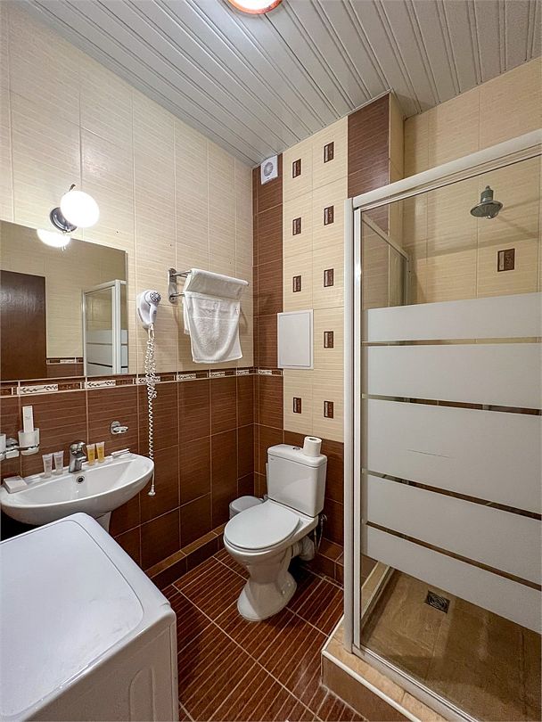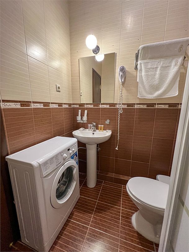 Санузел, фен, стиральная машина, халаты, тапочки, полотенце, мыло/шампунь