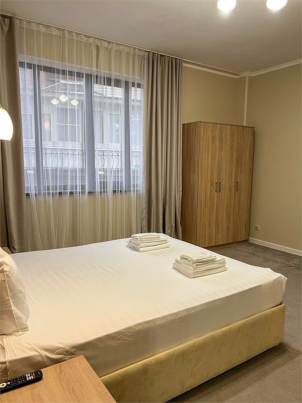 1 спальня — двуспальная кровать, две прикроватные тумбочки, столик с зеркалом, шкаф для одежды, телевизор, сплит-система, балкон.
