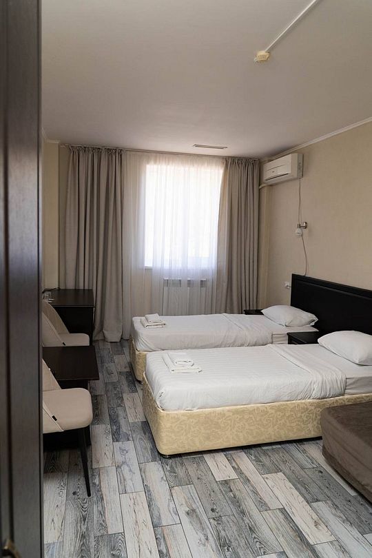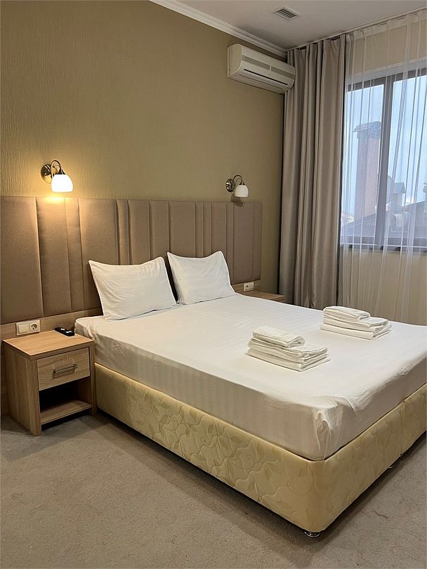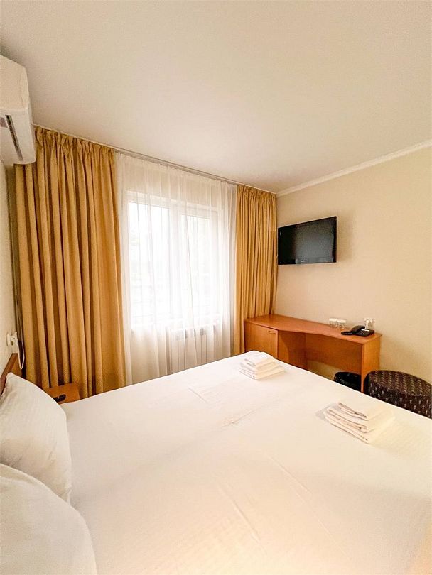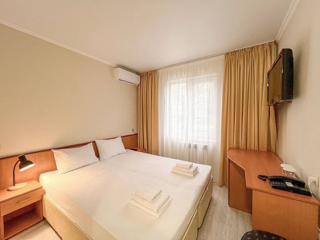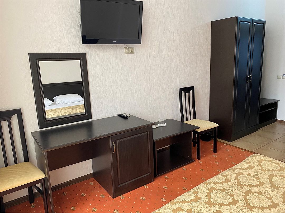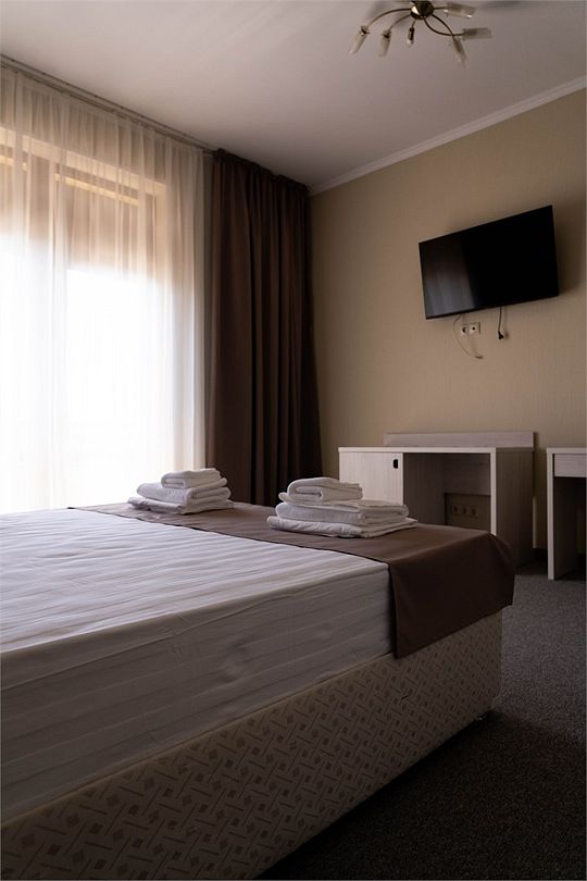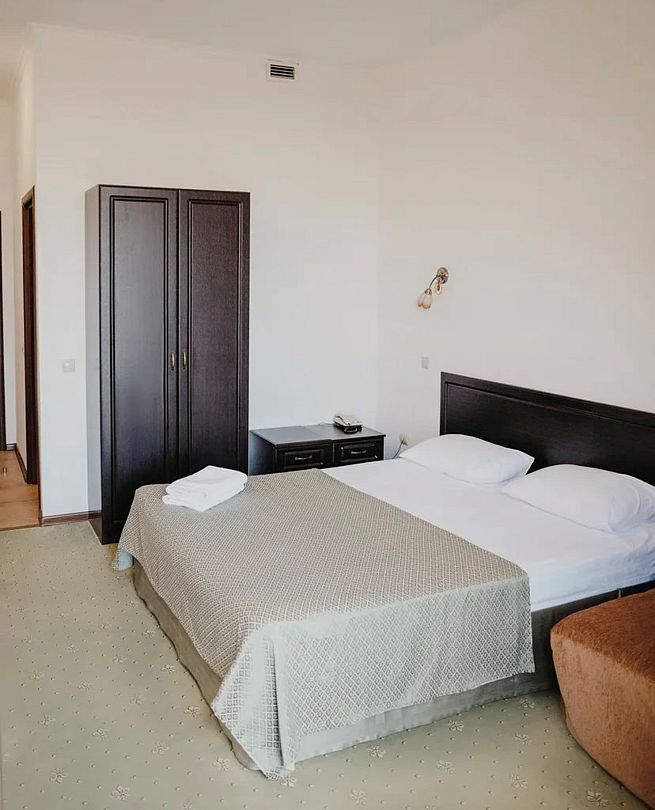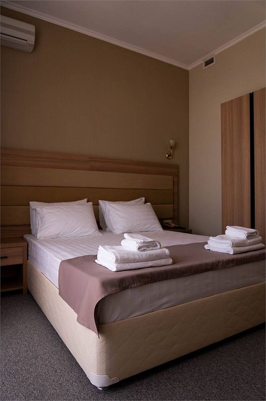 В номере — двуспальная или 2 раздельные кровати, 2 прикроватные тумбочки, столик с зеркалом, шкаф для одежды, сплит-система или кондиционер, телефон, телевизор, мини бар, фен, санузел, полотенце, мыло/шампунь, предусмотрено дополнительное место (одноместный раскладной диван).