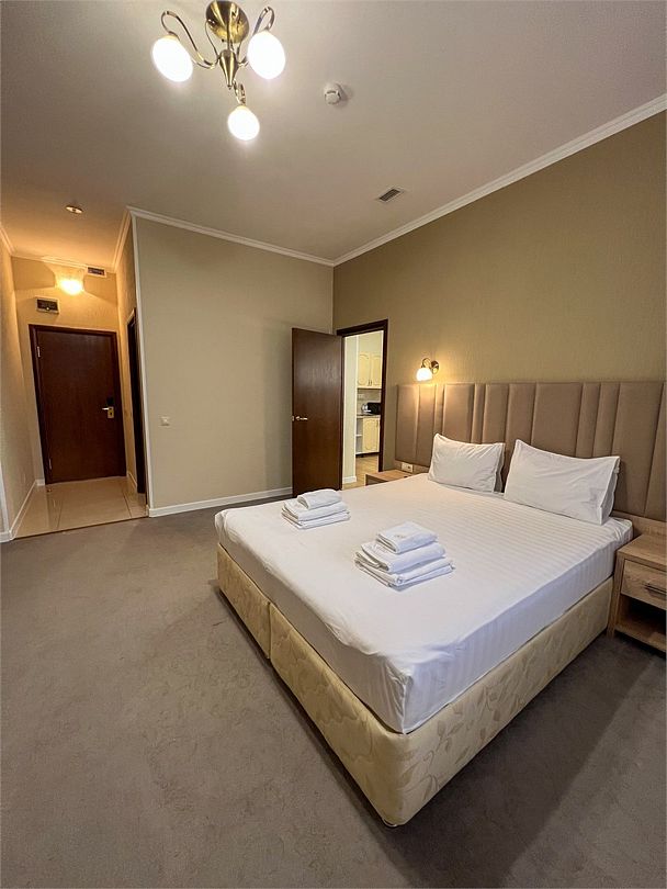 В номере: Гостиная с мини кухней, диван, журнальный стол, шкаф для одежды, телевизор, чайник, микроволновая печь, холодильник. Спальня — кровать, прикроватная тумбочка, шкаф, стол, сплит-система.