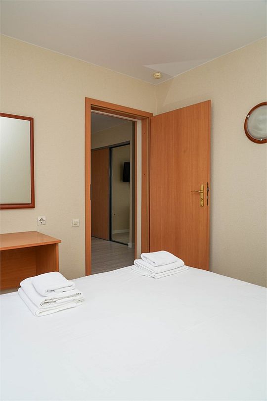 2 спальня — двуспальная кровать, две прикроватные тумбочки, столик с зеркалом, шкаф для одежды, телевизор, сплит-система, балкон.