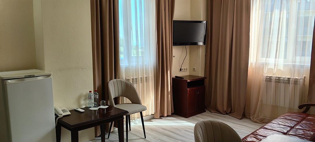 В номере: Гостиная — диван, журнальный стол, шкаф для одежды, телевизор, телефон, кондиционер, мини бар, санузел, полотенце, мыло/шампунь.