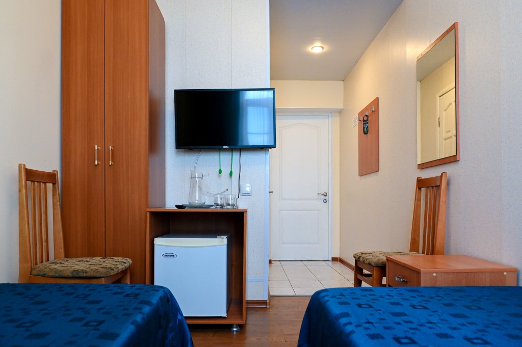Wi-Fi, кондиционер, ванна или душевая кабина, банные полотенца, две односпальные кровати, тумбы, шкаф для одежды, вешалки, зеркало, унитаз, раковина, кулер на этаже, вид во двор, цифровое тв, телевизор с плоским экраном, мини-холодильник, номер для некурящихВ гостиничном номере