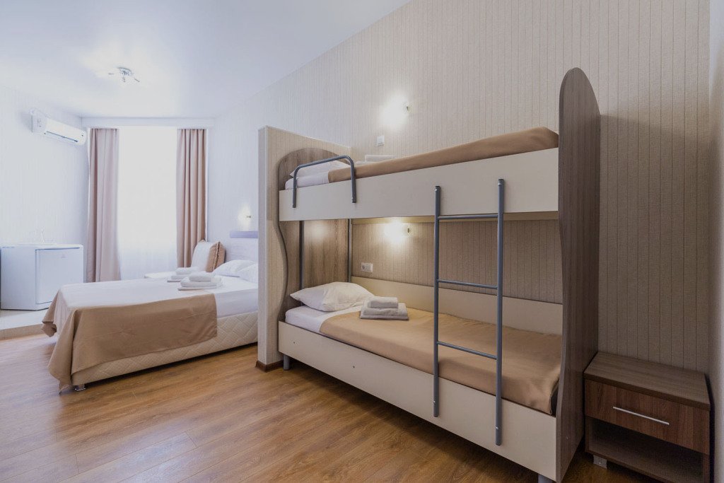 В номере расположены две отдельные односпальные кровати и одна двухъярусная кровать или одна двуспальная и одна двухъярусная кровати, или четыре односпальные кровати. Это отличный вариант для семьи с детьми.