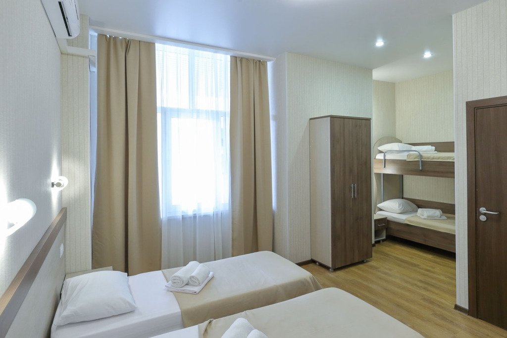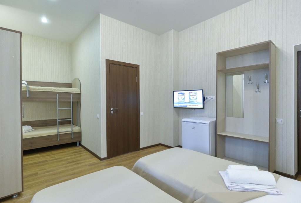 В номере расположены две отдельные односпальные кровати и одна двухъярусная кровать или одна двуспальная и одна двухъярусная кровати, или четыре односпальные кровати. Это отличный вариант для семьи с детьми. Номера данной категории расположены на 1-ом, 2-ом этаже и 3-ей площадке (необходимо подняться один этаж пешком).Услуги и удобства