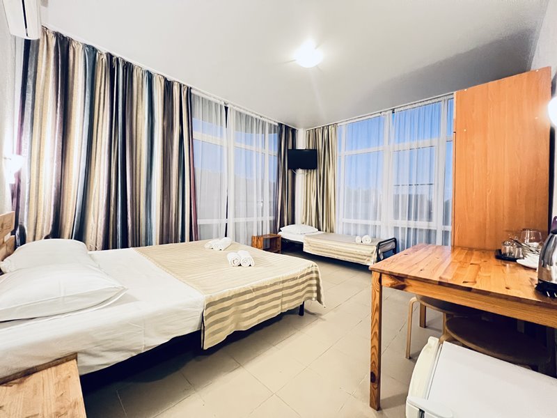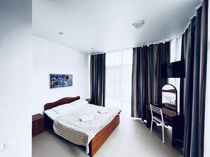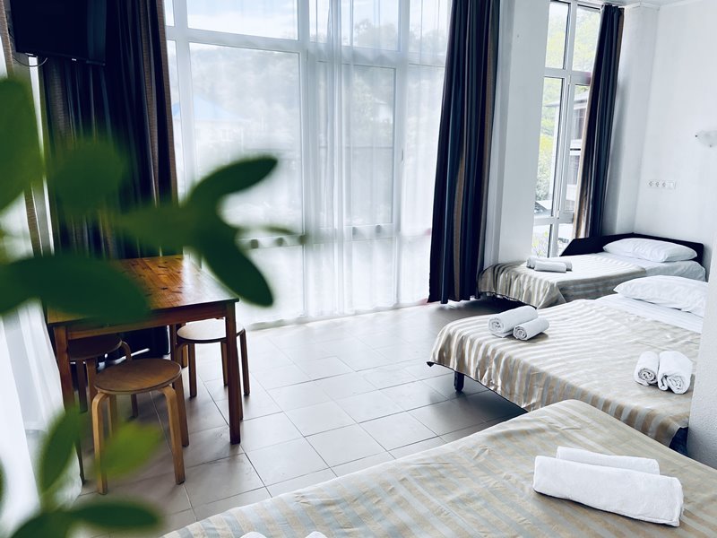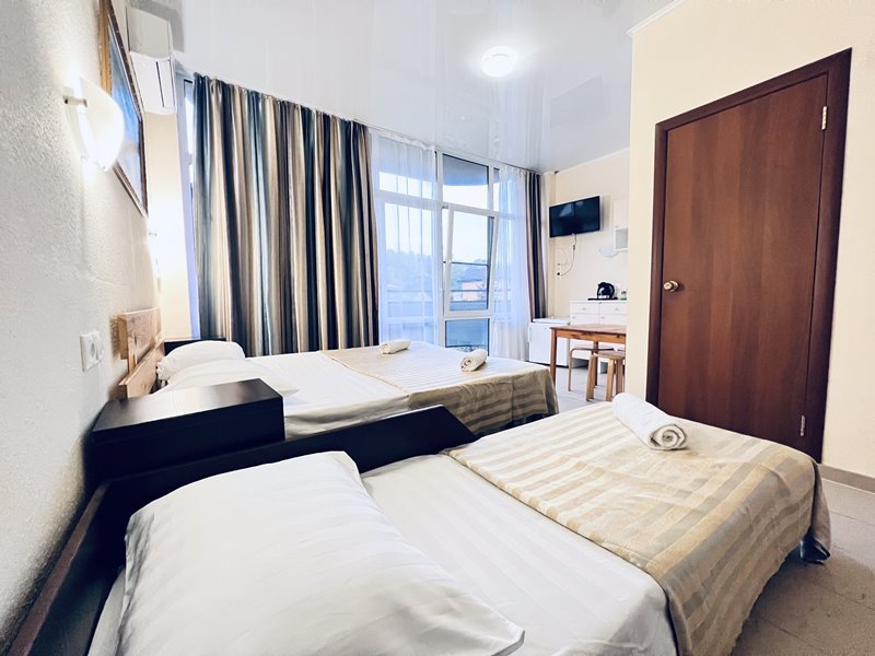 Номера — от уютных стандартов до просторных апартаментов на 4-6 человек. В каждом есть балкон, кондиционер, телевизор, холодильник и своя ванная комната. На первом этаже — общая кухня со всей необходимой техникой и посудой.