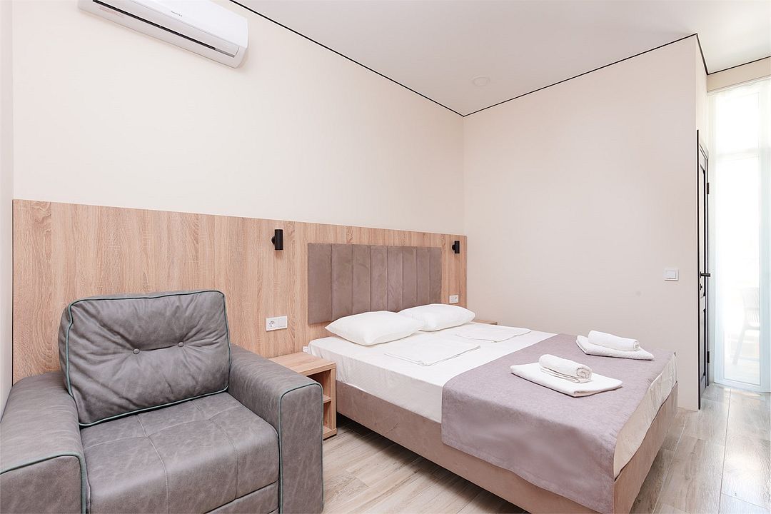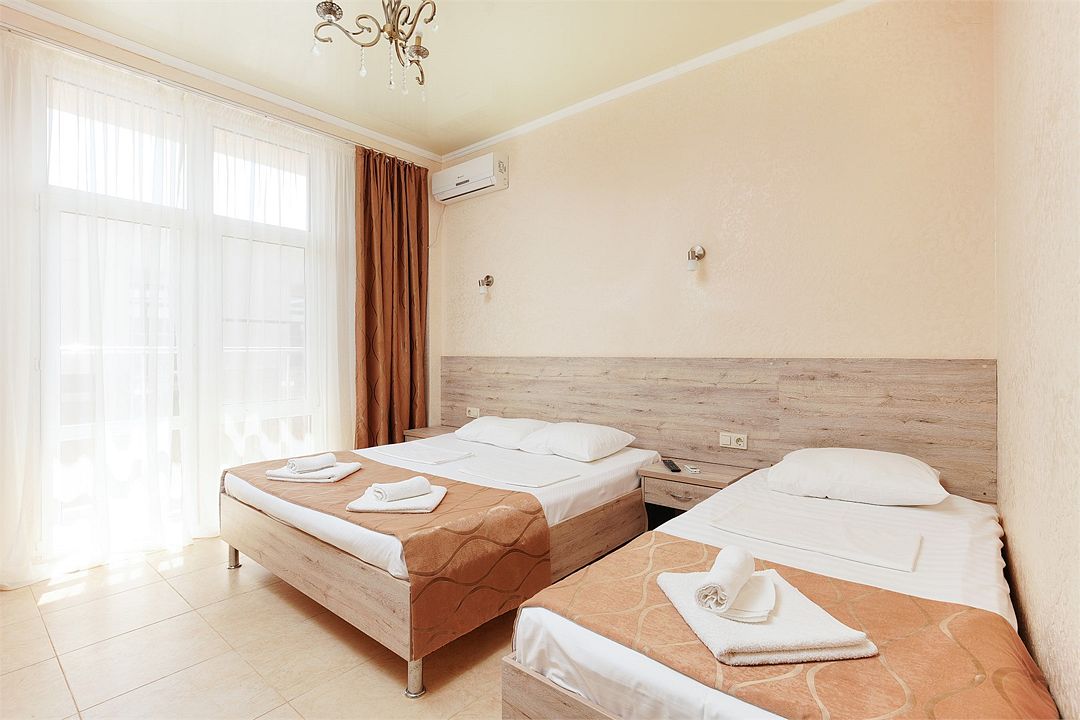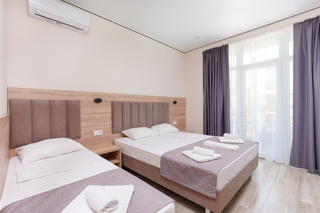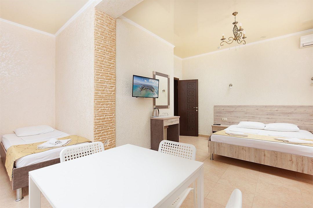 Уютный однокомнатный номер с двуспальной и односпальной кроватями, либо раскладным креслом, балконом или террасой.