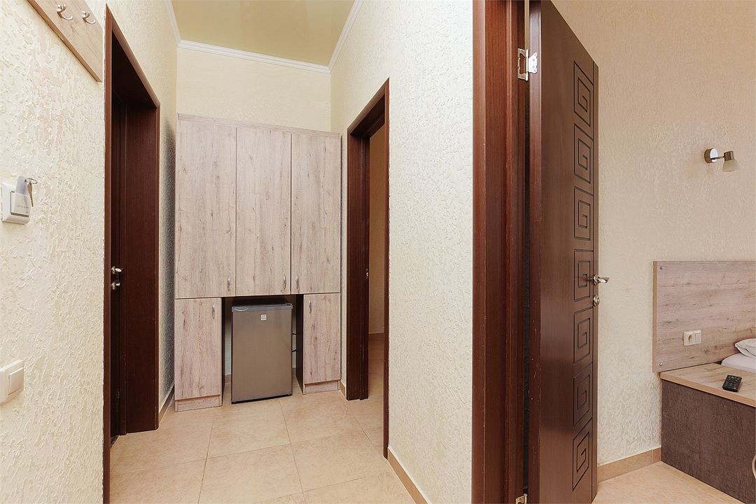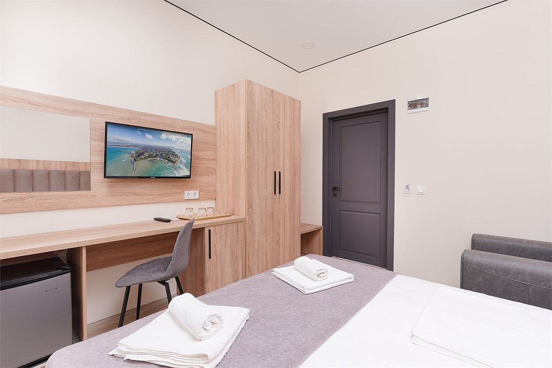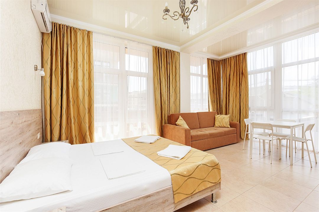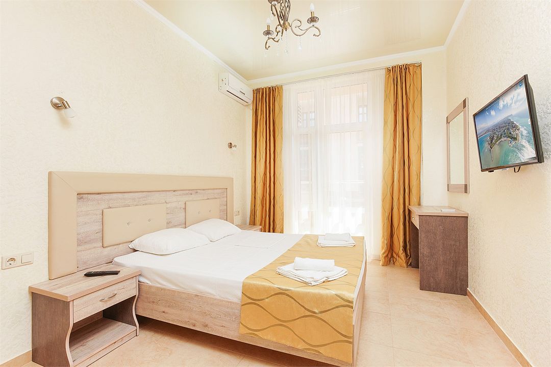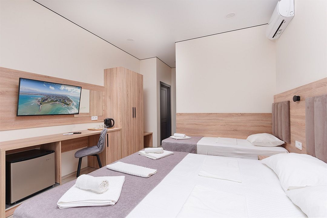 Уютный однокомнатный номер с двуспальной и односпальной кроватями, либо раскладным креслом, балконом или террасой.