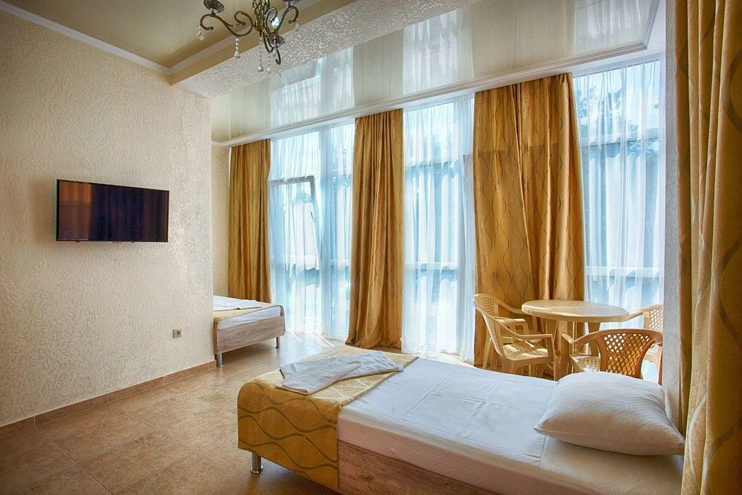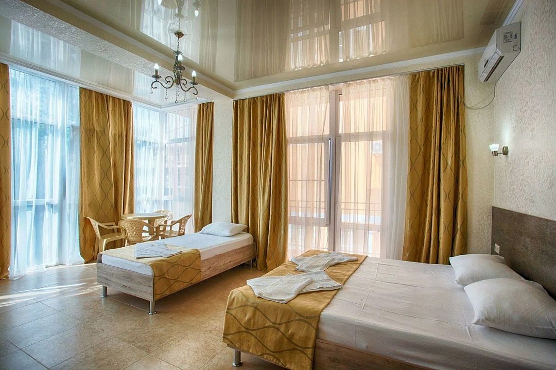 Трехэтажный корпус отеля разместился в 150 метрах от морского побережья. Гостей ожидают просторные светлые номера, в общей сложности рассчитанные на размещение 88 человек. В каждом номере имеется индивидуальный санузел, кондиционер, плазменный телевизор, холодильник, также предусмотрены мебелированные балконы.
