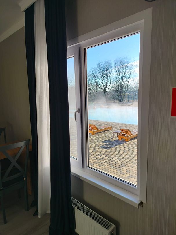 В отличии от номеров категории Стандарт, номера данной категории не только расположены ближе к бассейну, но еще и имеют вид на бассейн. В номере установлен телевизор, холодильник для хранения продуктов, а также сплит-система для поддержания оптимальной температуры. Для удобства гостей предусмотрен электрический чайник. Собственная душевая комната укомплектована полотенцами для бассейна, для душа, рук и ног, а также шампунем, жидким мылом и гелем для душа. При аренде данного номера гостям предоставляется: бесплатная парковка, пользование бассейнами, общей теплой беседкой и общей мангальной зоной, зоной спа (хаммам).
