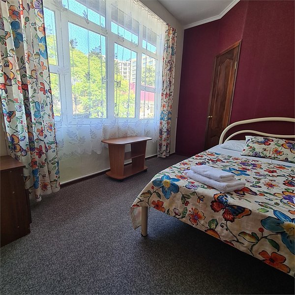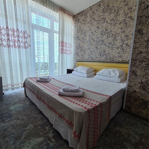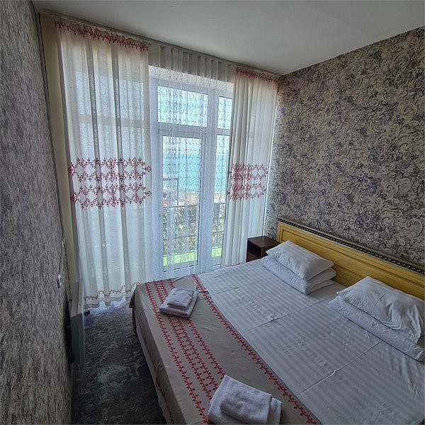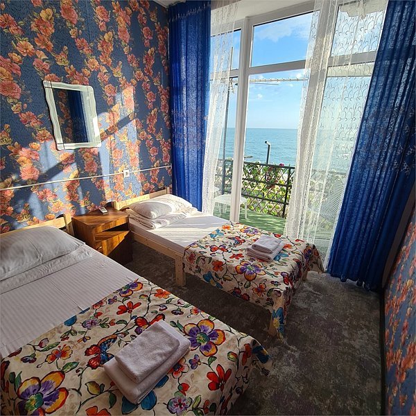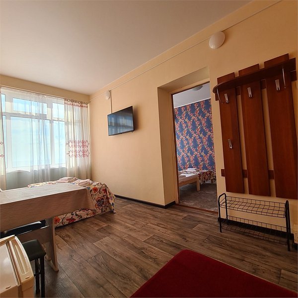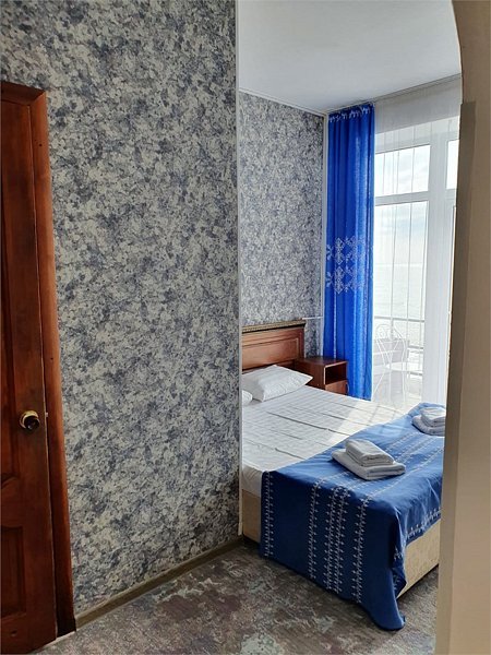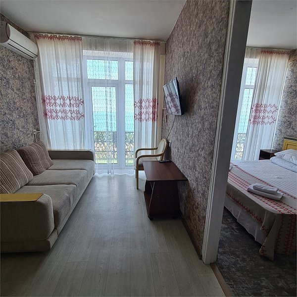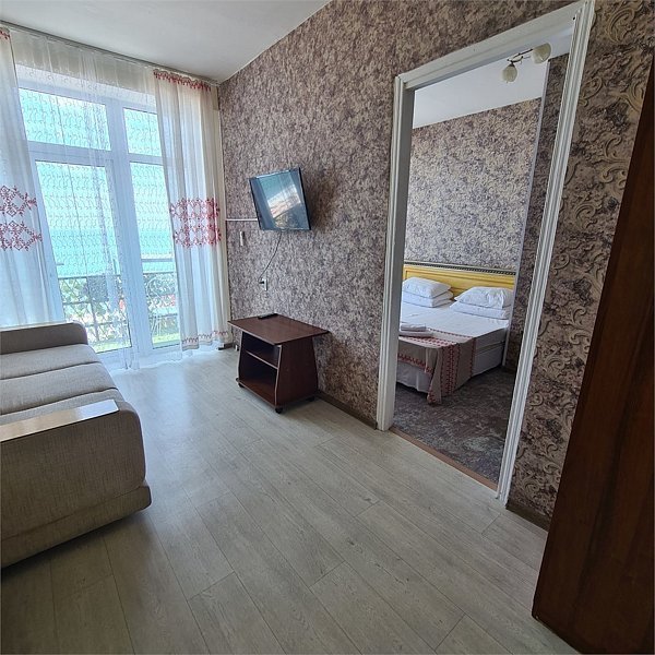 Семейный 2х комнатный номер с балконом и видом на море. Вместимость до 4 мест. Один ребёнок до 5 лет — можно без отдельного спального места.