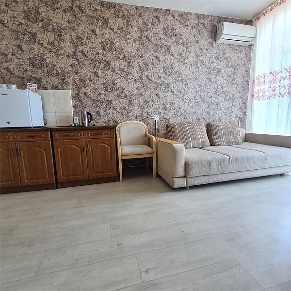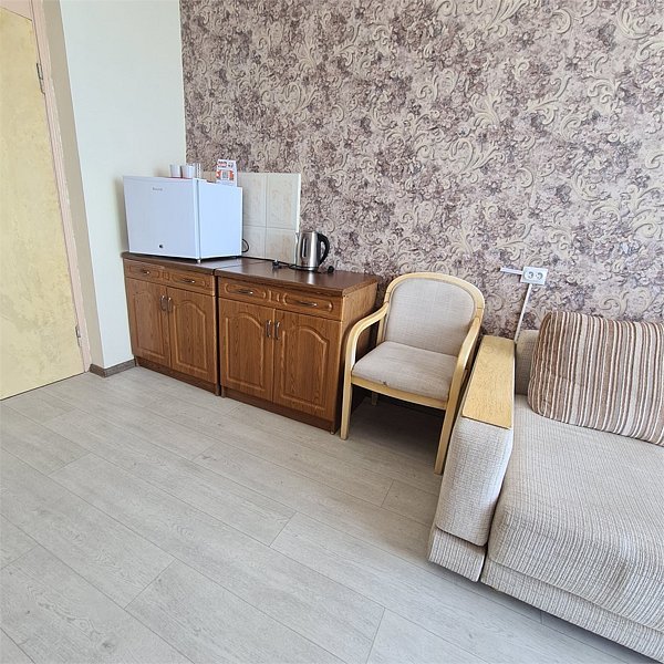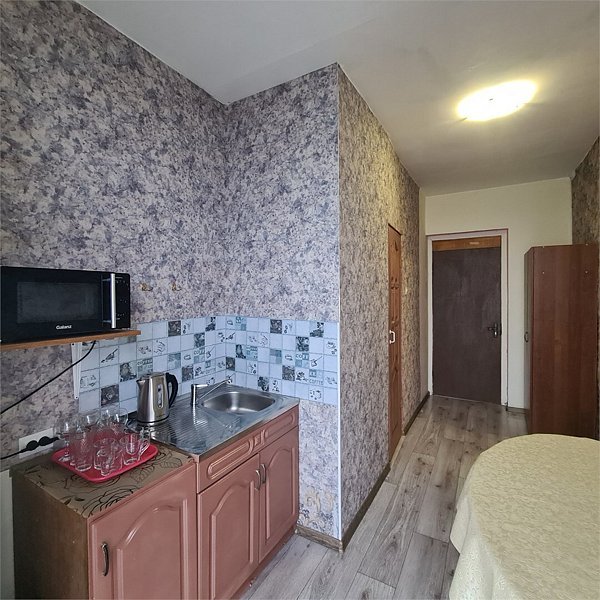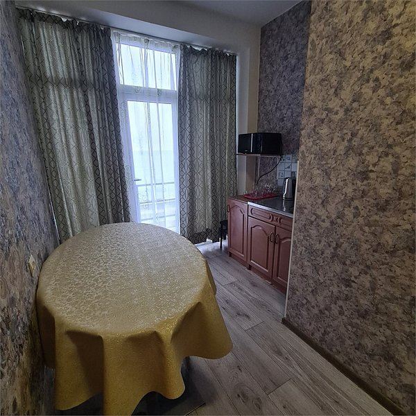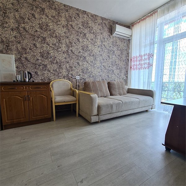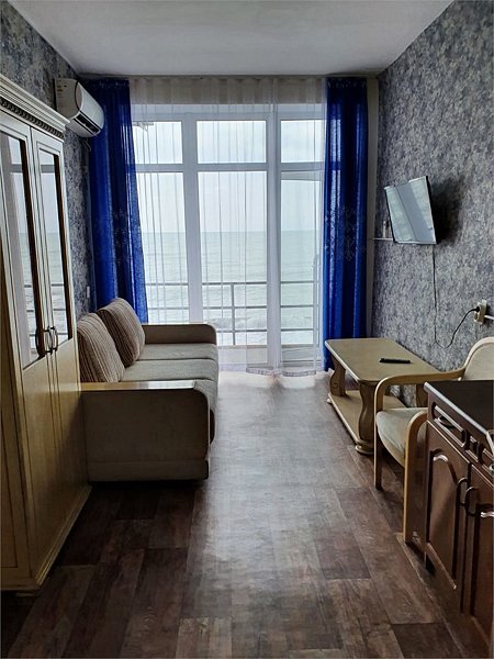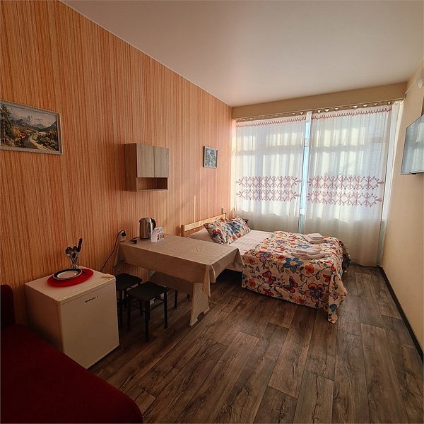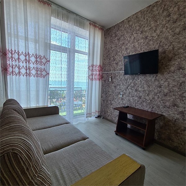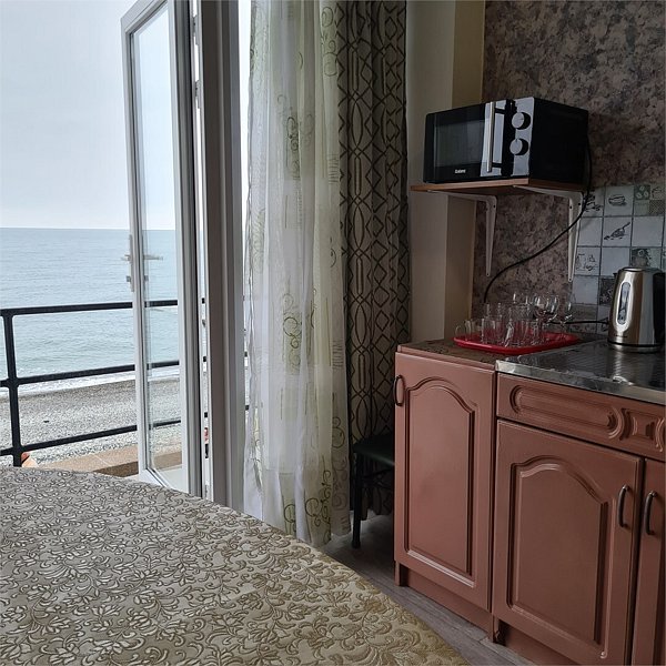 Большой номер с кухней и балконом с видом на море. Вместимость до 4 мест. Один ребёнок до 5 лет — можно без отдельного спального места.
