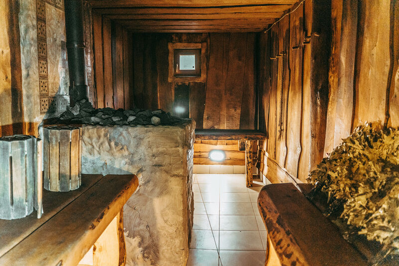 Двухэтажный банный комплекс в деревянном строении в уютном альпийском стиле с элементами «хоббитской» избушки. Просторная русская парная, ведра для обливания, горячая купель на крыше-терассе и большой проточный бассейн с холодной водой – все это к услугам наших гостей.