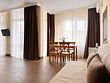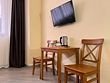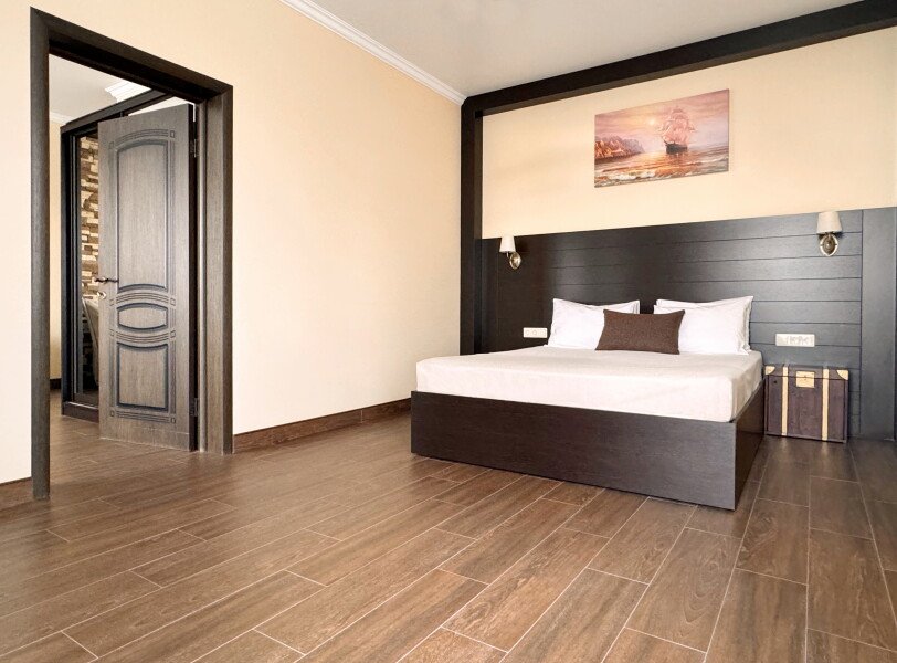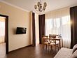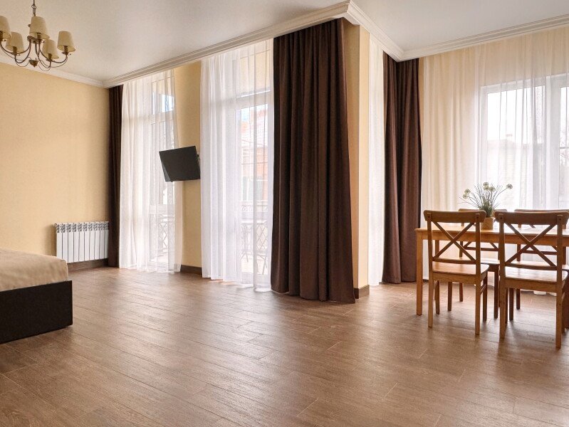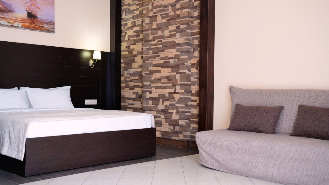Однокомнатный номер с отдельным входом. Номер оснащен: двуспальная кровать, диван-кровать (140х190), прикроватные тумбочки, шкаф-купе, обеденная группа, ТВ, кондиционер, сейф, мини-холодильник, бутилированная вода, чайная станция.