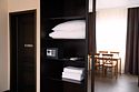 Однокомнатный номер без балкона. Номер оснащен: двуспальная кровать или две односпальные кровати, кресло-кровать, прикроватные тумбочки, шкаф-купе, стол, стулья, вешалка, обувница, ТВ, кондиционер, сейф, мини-холодильник, бутилированная вода, чайная станция.