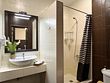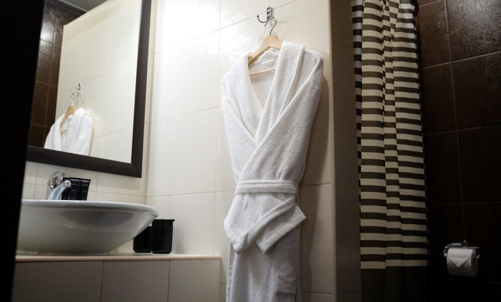 Ванная комната: душ, раковина, туалет, полотенцесушитель, фен, полотенца, гигиенические средства, халат, тапочки.