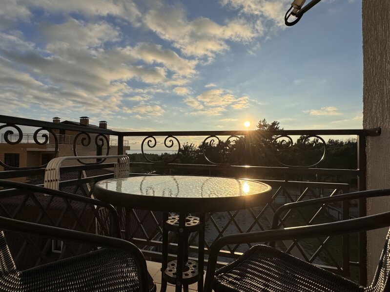 Ванная комната: душ, раковина, туалет, полотенцесушитель, фен, полотенца, гигиенические средства, халат, тапочки. Балкон с видом на море.