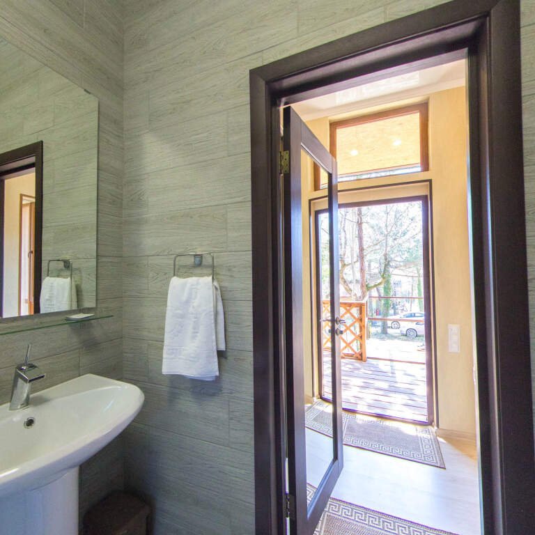 июль 2021 г.Тишина и спокойствие !!!!Расположение - 4 км по убитой дороге в горах . Кроссовер без проблем преодолел подъем, на седане - я бы не поехал ( есть трансфер за доп. плату). Сам отель -небольшой с хорошими номерами . В номерах витражное остекление и веранды . Все окна на лес . В этом и заключается его прелесть : тишины , спокойствие , воздух ...Если хотите -разгрузить голову и побыть вдали от суеты - это отличный выбор . К морю -действительно ведет достаточно крутой спуск-подъем , но это неудобство компенсируется минимальным количеством людей на пляже . ( для пляжа -тапочки от кораллов -обязательны) . В номерах -чисто , на летней кухне есть все необходимое для мангала и самостоятельного приготовления еды . Завтраки -не впечатлили , но рядом есть отель Грин Вудд с обалденными завтраками за 400 рублей с человека . Степан ,хозяин отеля , -оказывает всю необходимую помощь и решает все вопросы по проживанию . С удовольствием приедем еще раз и рекомендуем отель к посещению !!!