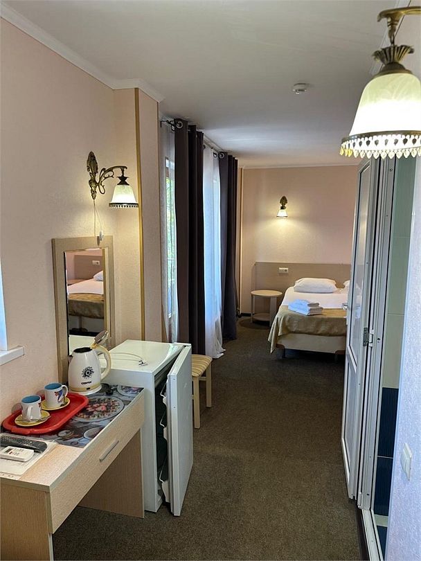 Wi-Fi, холодильник, санузел, балкон, односпальная кровать, гладильная доска, тумбы, шкаф для одежды, зеркало, кухня, сейф, чайник, унитаз, ковровое покрытие, отдельный вход в номер, душ, плиточное покрытие, вид во двор, туалетный столик, сплит-система, телевизор с плоским экраном, пуфик, уборка номера, услуги прачечной (платно), вешалки-плечики, частный дворВ гостиничном номере
