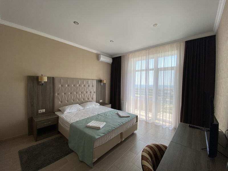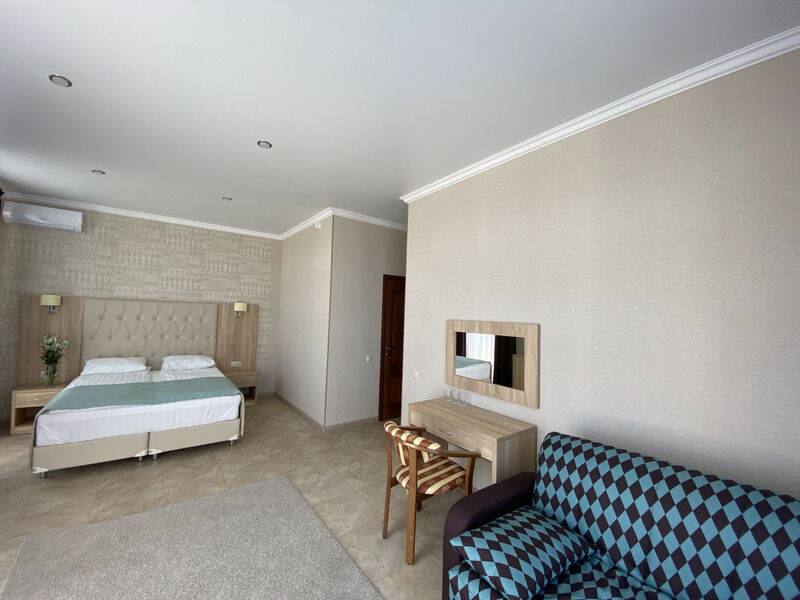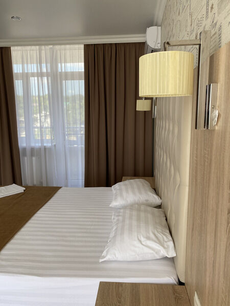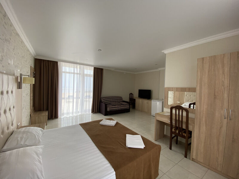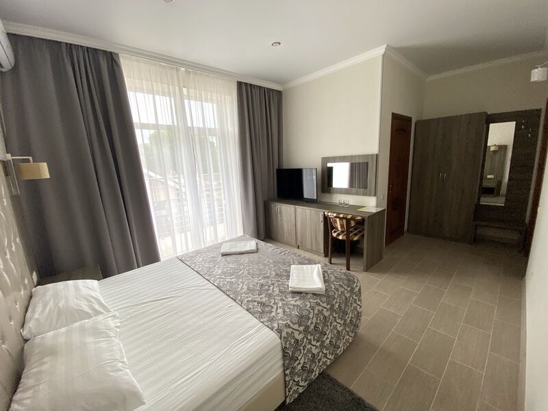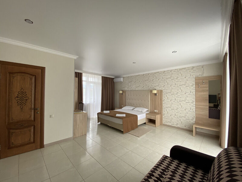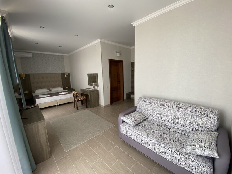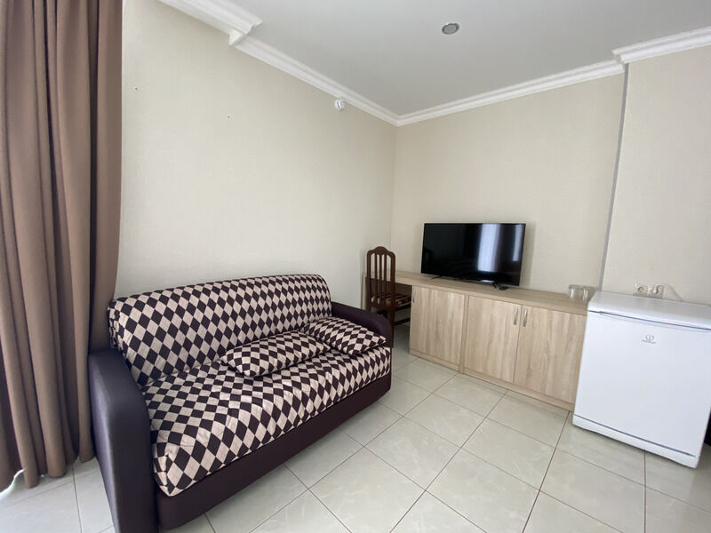 основные места - двуспальная кровать и раскладной диван, с/у с душем, ТВ, мини-холодильник, К