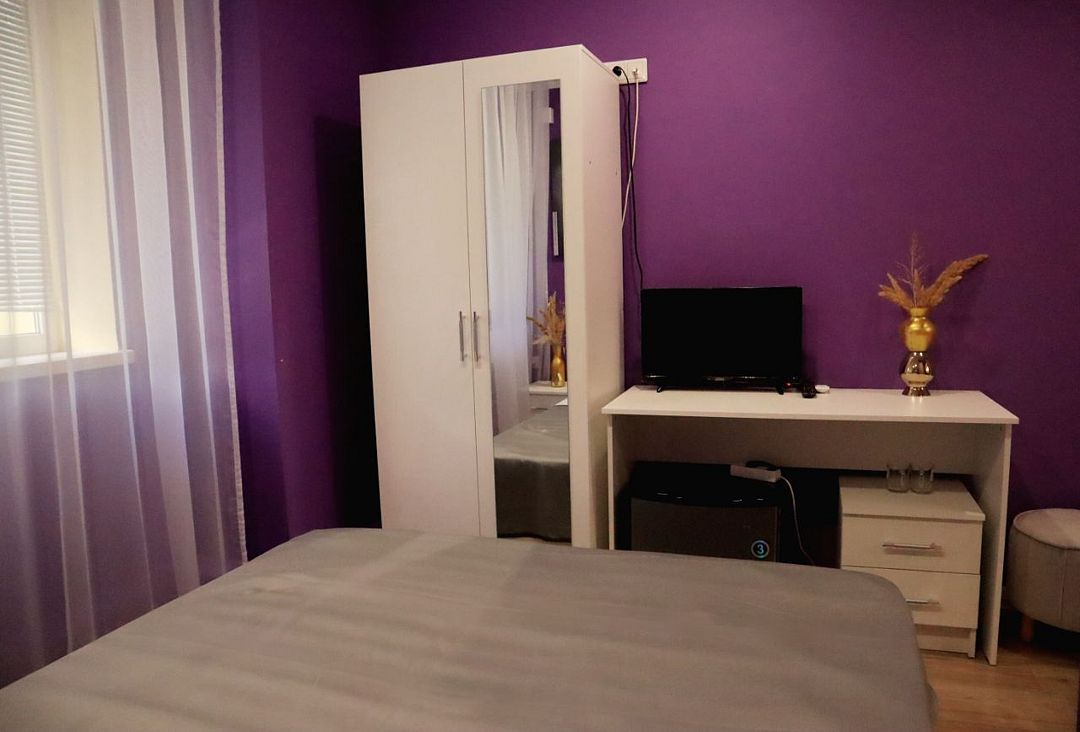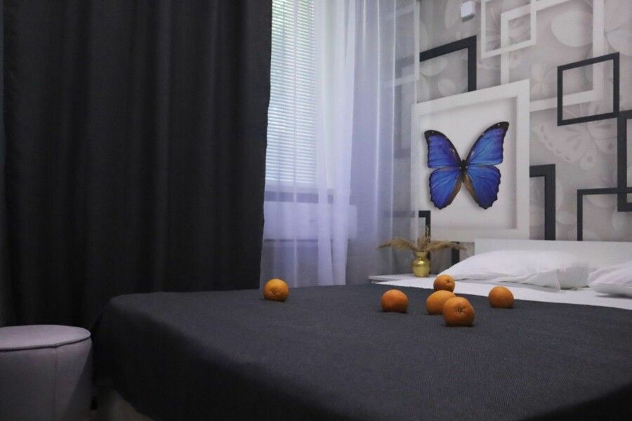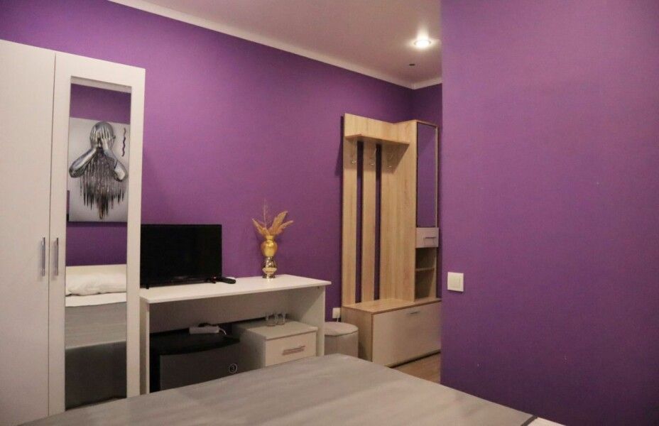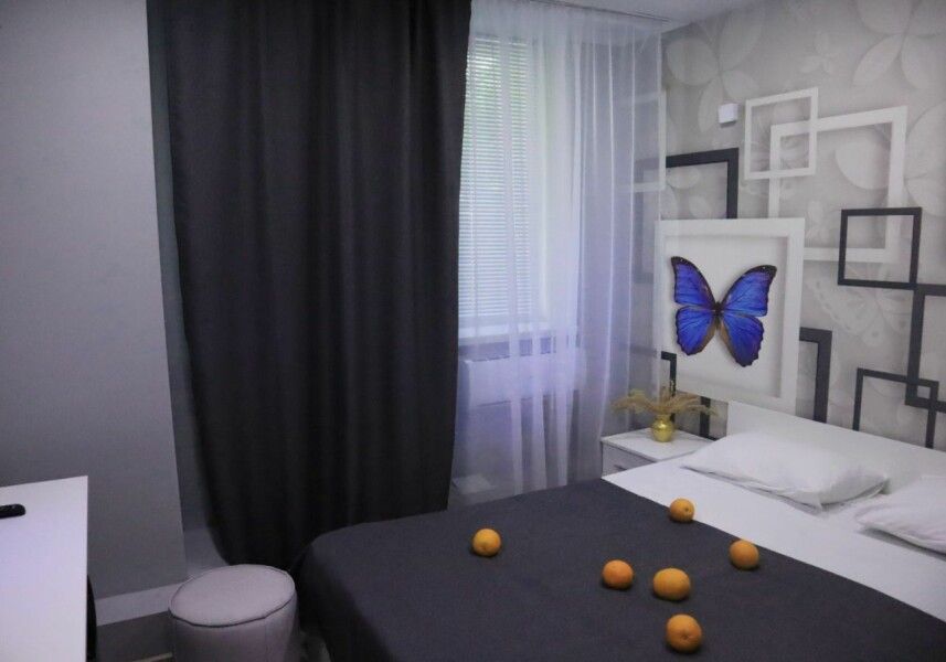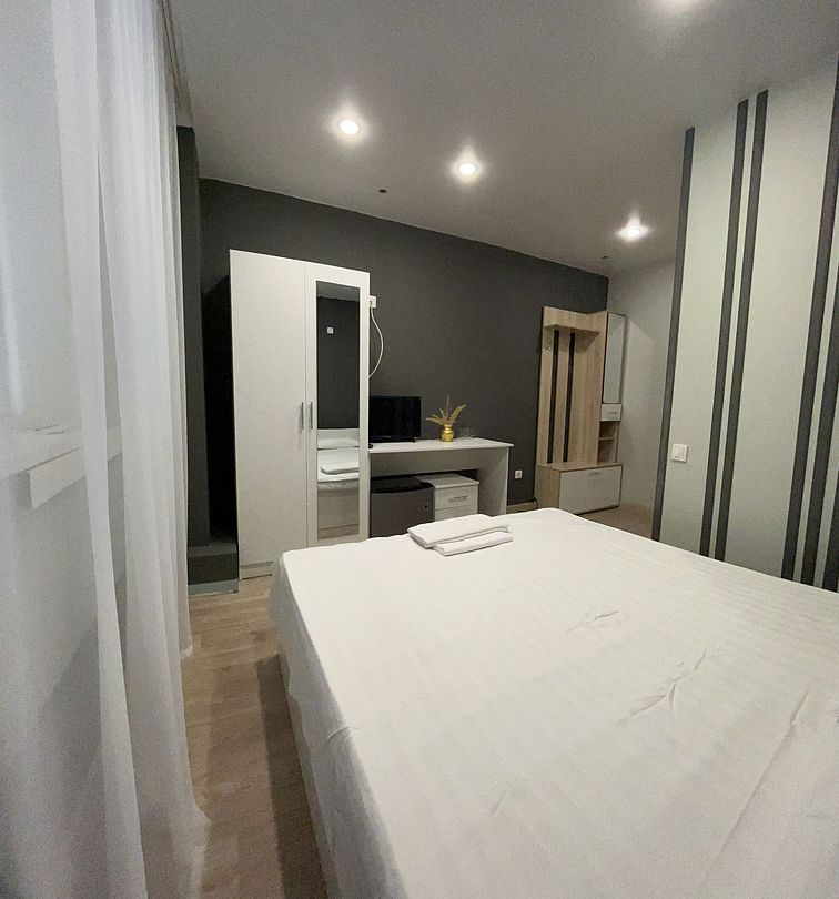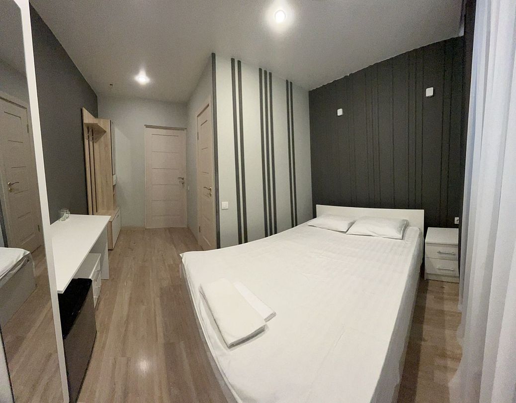 Стильный и современный однокомнатный номер. В номере одна двуспальная кровать, телевизор, кондиционер, холодильник, ванная комната с душем и косметическими средствами, фен, тапочки.