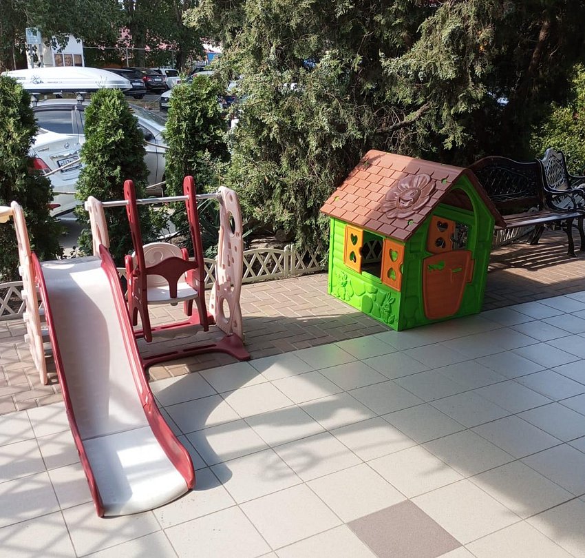Семейный отдыхДостоинстваНомер хороший. Своя столовая. В кафе можно заказать отличный шашлык. Неподалеку — дельфинарий, крутой аквапарк. До моря близко.