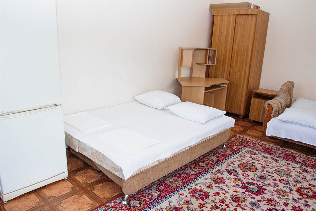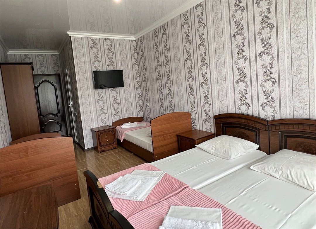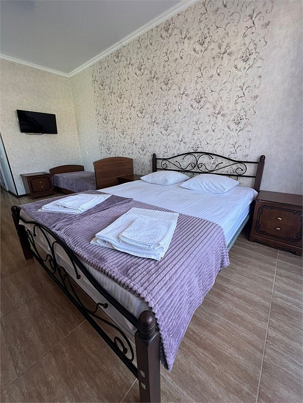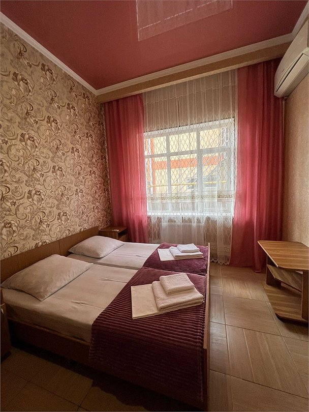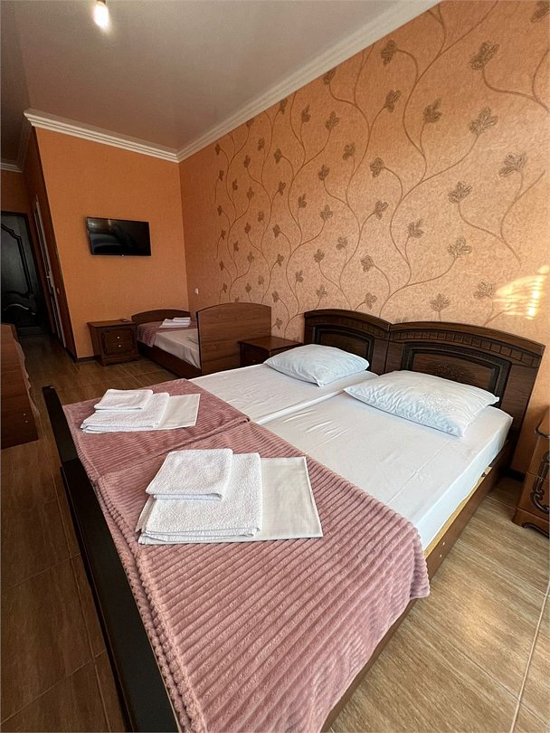 В номере 1 двуспальная кровать, 1 односпальная, кондиционер, телевизор, холодильник, 2 тумбочки, 1 стул, журнальный столик, шкаф Душ туалет общий на 3 номераУслуги и удобства