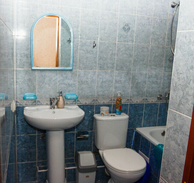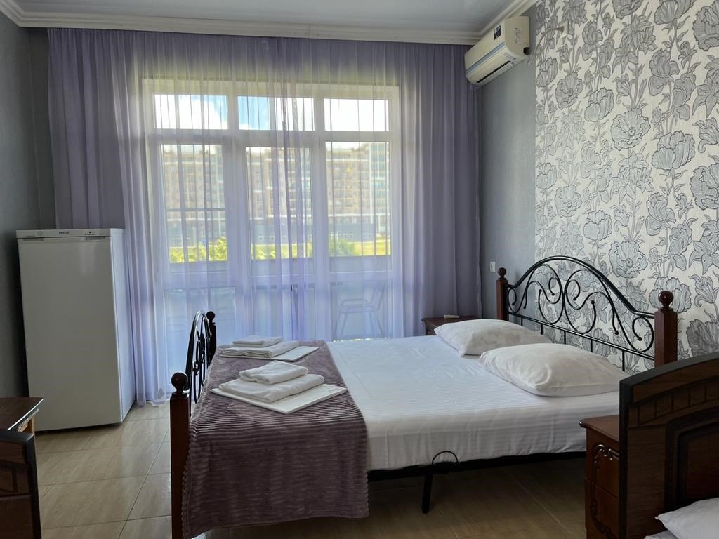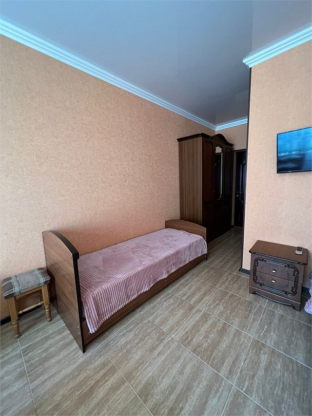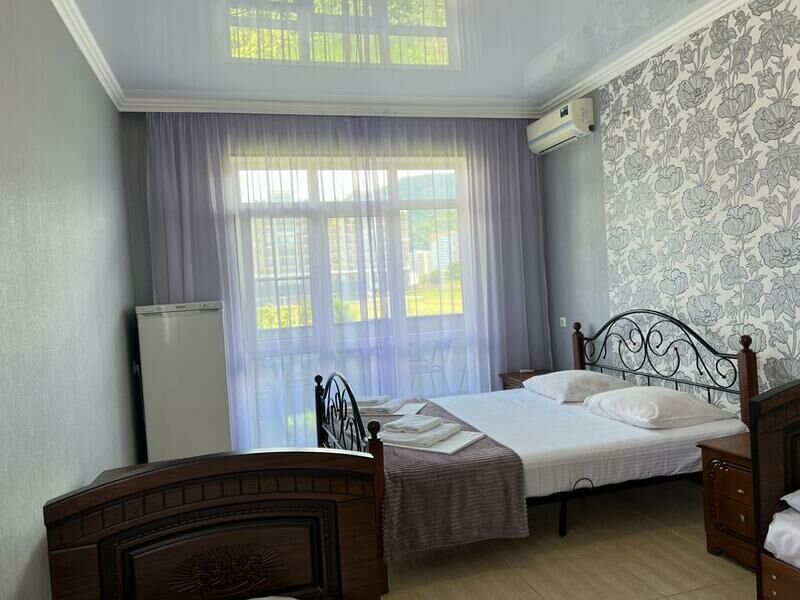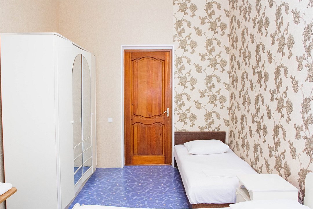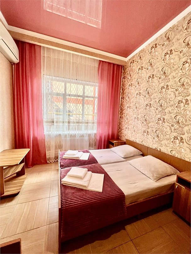 В номере 1 двуспальная кровать, 1 односпальная, кондиционер, телевизор, холодильник, 2 тумбочки, 1 стул, журнальный столик, шкаф Душ туалет общий на 3 номераУслуги и удобства