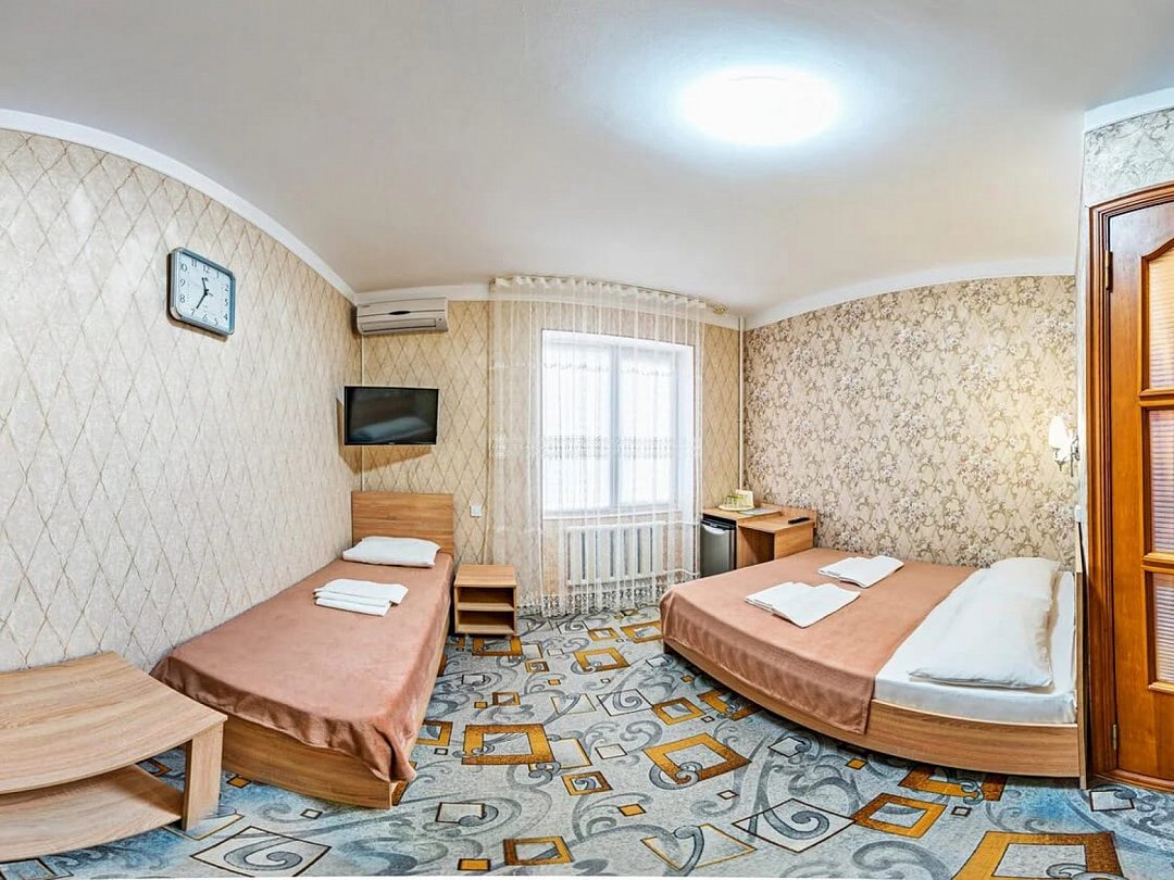 двуспальная и односпальная кровати, кондиционер, тв, холодильник, чайный набор посуды, кулер на этаже, санузел с душем (поддон)