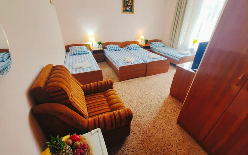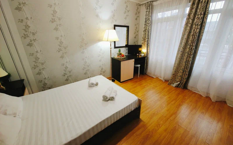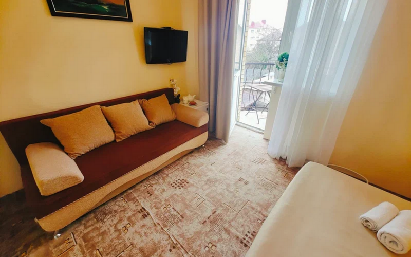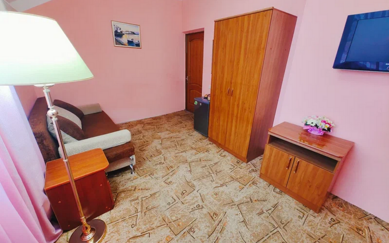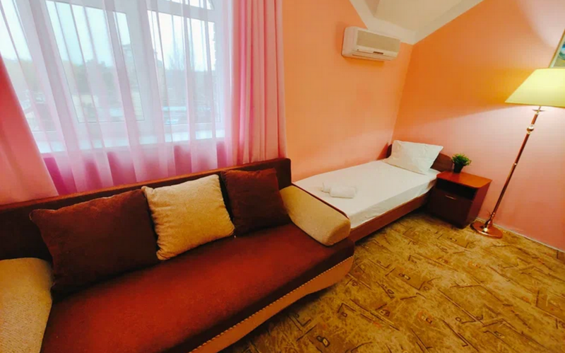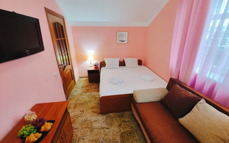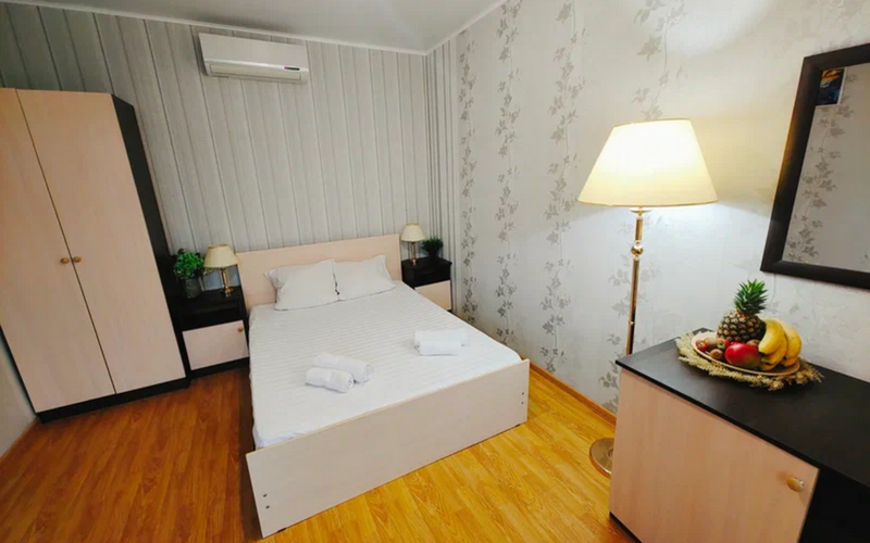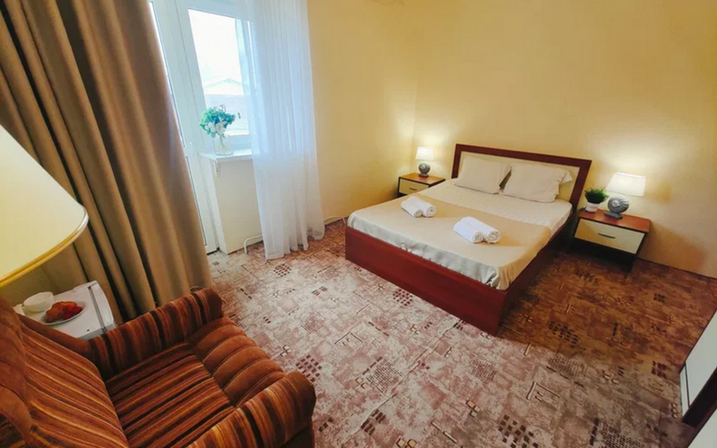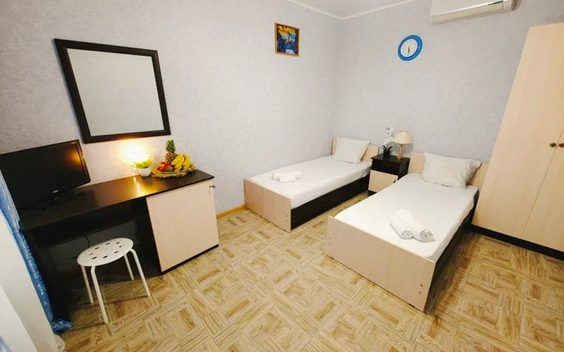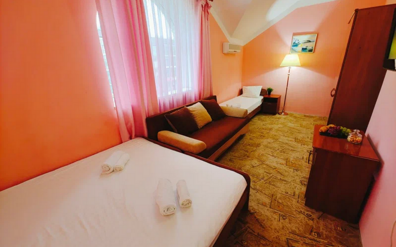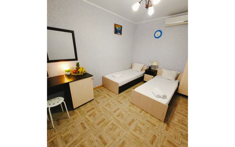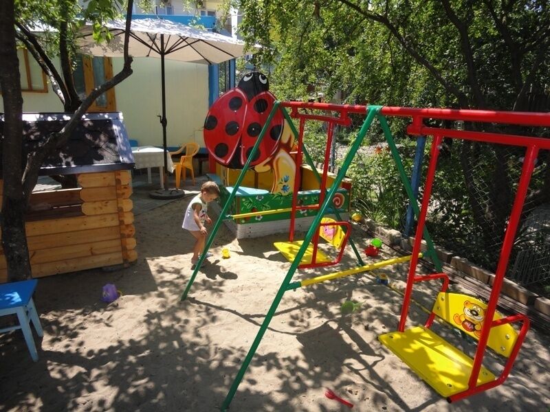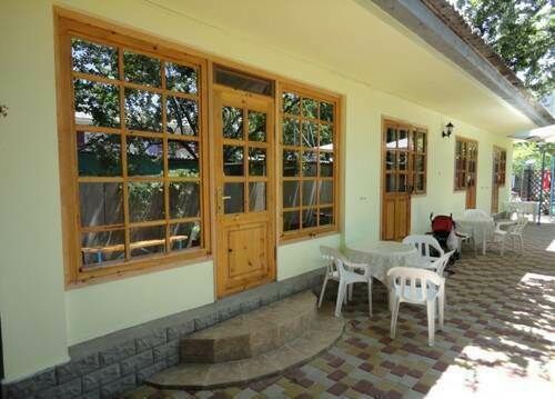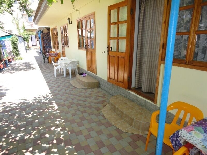 Гостевой дом состоит из трех этажей. Гости смогут выбрать наиболее подходящий для себя номер со всеми удобствами и современной мебелью. Некоторые номера оснащены балконами, на которых оборудованы уютные места для отдыха на свежем воздухе. В гостевом доме имеется кухня со всем необходимым кухонным инвентарем. Помимо этого всем отдыхающим предлагаются вкуснейшие комплексные обеды и ужины. Любители недорогого отдыха смогут расположиться в финских домиках с общими удобствами на территории двора. В шаговой доступности от дома находятся аквапарк, торговый центр, рынок, магазины, кафе. Для маленьких гостей во дворе оборудована детская площадка, где ваши чада смогут весело провести время и порезвиться в полной безопасности. Свои автомобили гости могут оставить на парковке.