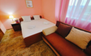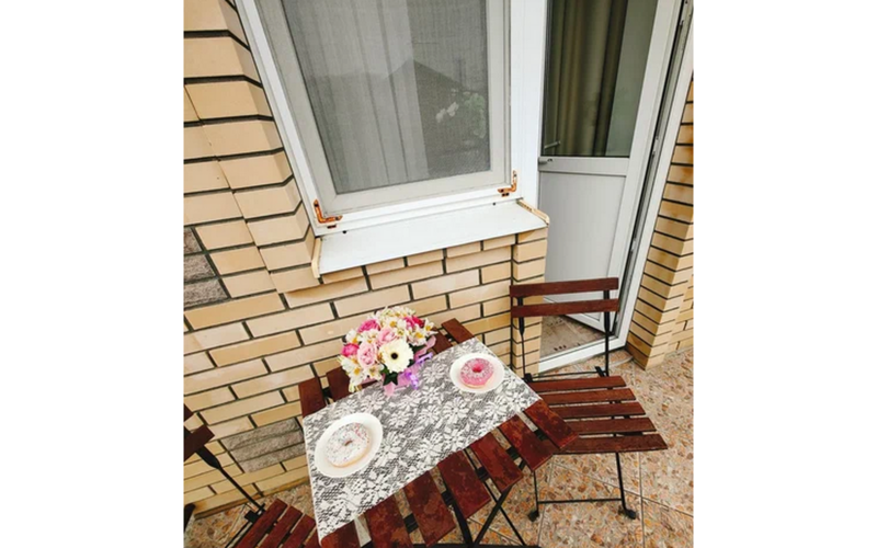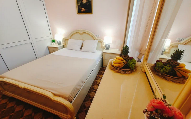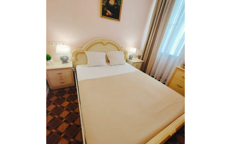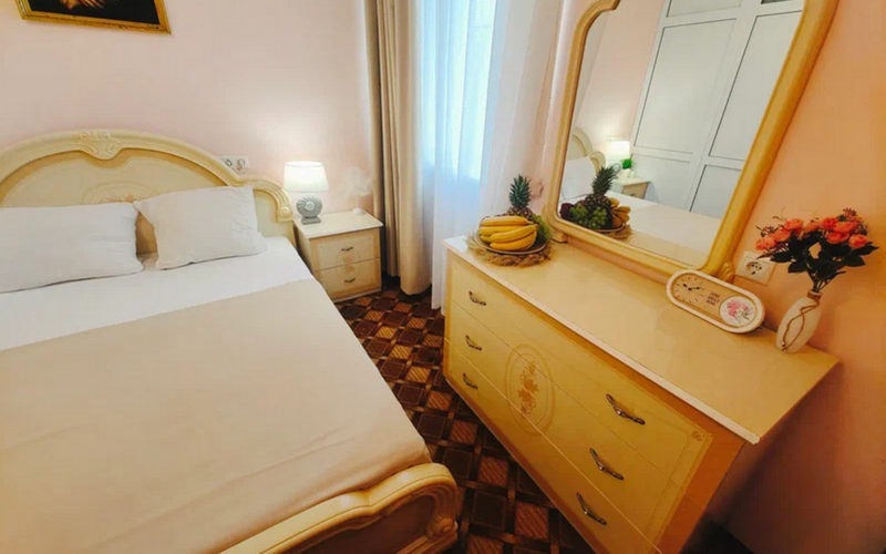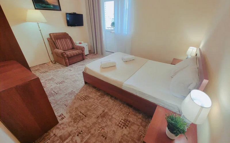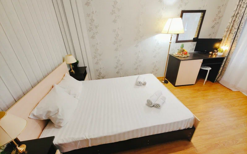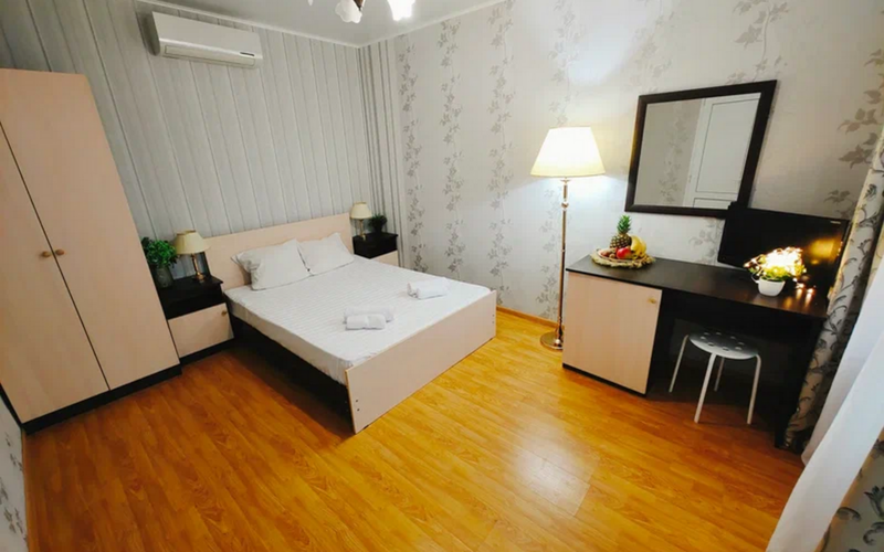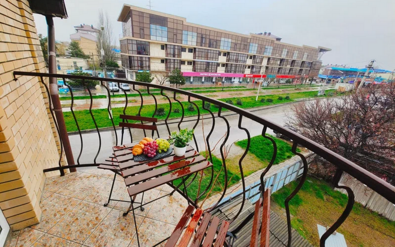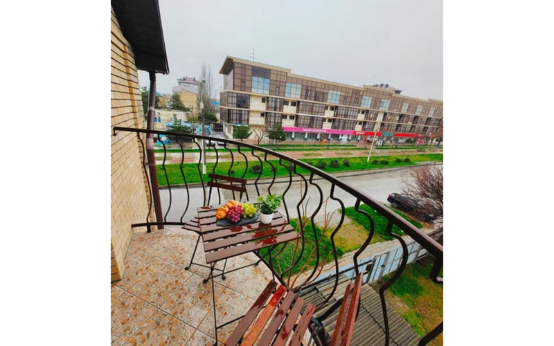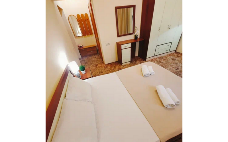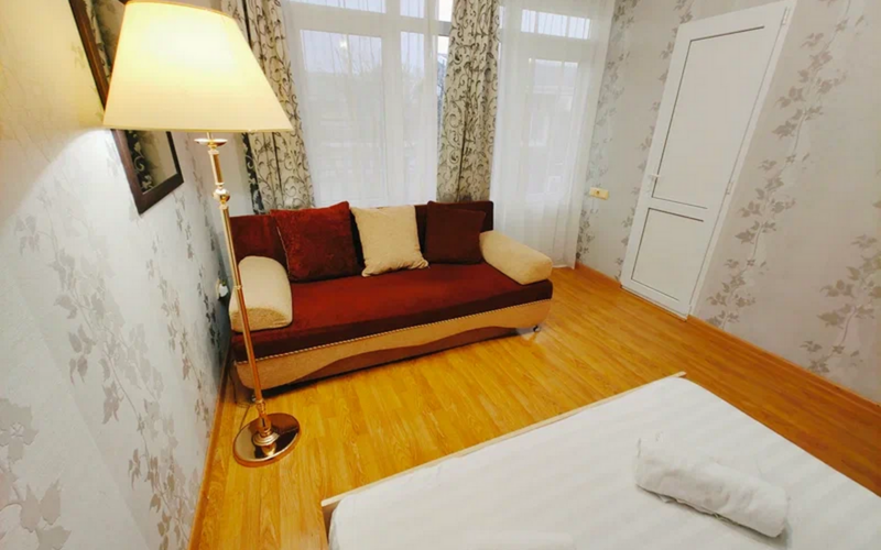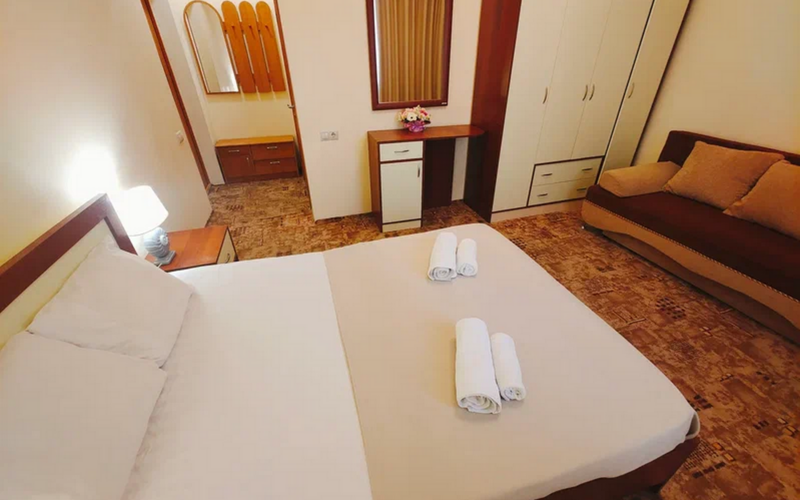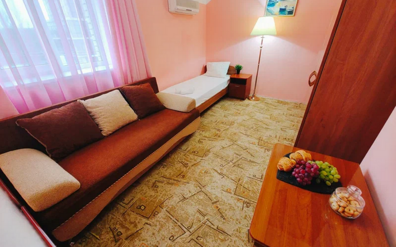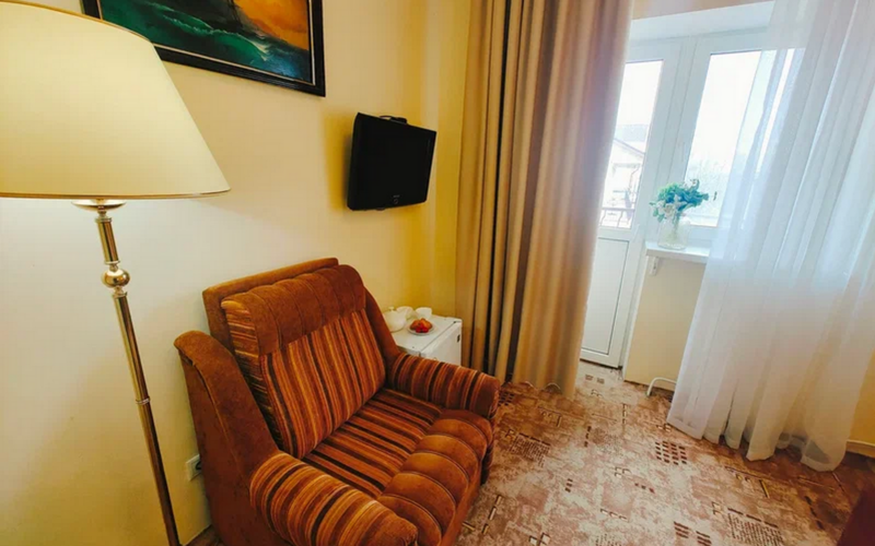 Гостевой дом состоит из трех этажей. Гости смогут выбрать наиболее подходящий для себя номер со всеми удобствами и современной мебелью. Некоторые номера оснащены балконами, на которых оборудованы уютные места для отдыха на свежем воздухе. В гостевом доме имеется кухня со всем необходимым кухонным инвентарем. Помимо этого всем отдыхающим предлагаются вкуснейшие комплексные обеды и ужины. Любители недорогого отдыха смогут расположиться в финских домиках с общими удобствами на территории двора. В шаговой доступности от дома находятся аквапарк, торговый центр, рынок, магазины, кафе. Для маленьких гостей во дворе оборудована детская площадка, где ваши чада смогут весело провести время и порезвиться в полной безопасности. Свои автомобили гости могут оставить на парковке.