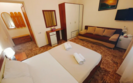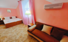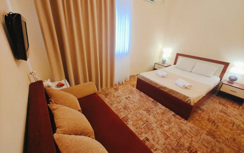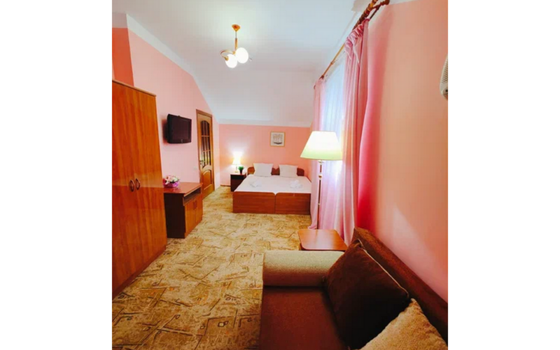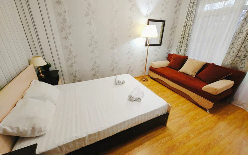 Одна двуспальная кровать, одна диван-кровать, одно раскладное креслоВ гостиничном номере