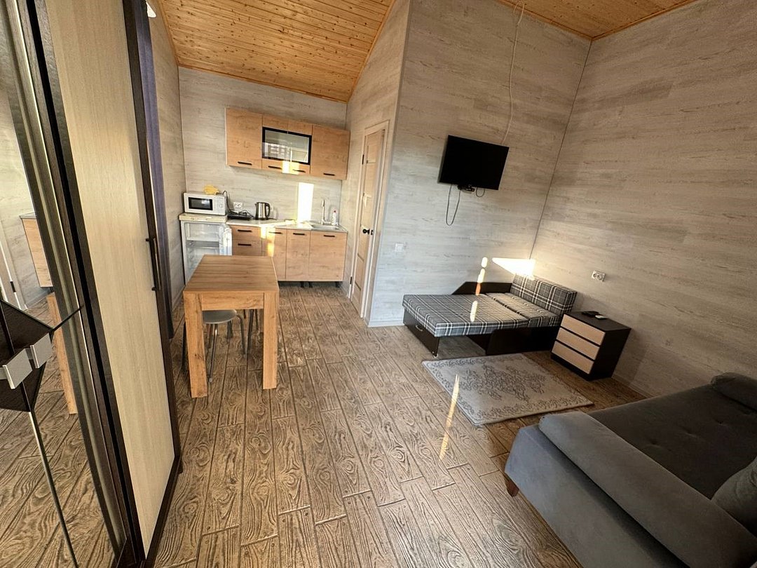 телевизор, Wi-Fi, холодильник, кондиционер, светильник, плита для приготовления пищи, микроволновая печь, ванна, санузел, диван, стулья, обеденный стол, зеркало, кухня, набор посуды, чайник, унитаз, раковина, обеденная зона, плиточное покрытие, вид во двор, кухонная посуда, стаканы, кухонная утварь, столовые приборы, туалетные средства, сплит-система, мангал, принадлежности для барбекю, диван-кровать, мини-кухня, кухонный уголок, номер для некурящих, мылоВ апартаментах