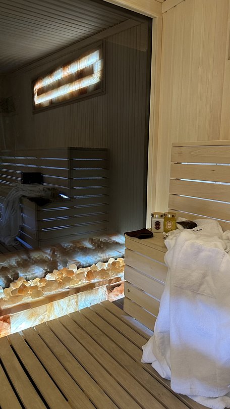 Инфраструктура: тапочки, полотенца, простыни, халатыТемпература парения: 60 °CВ SPA-комплексе гости могут насладиться альпийской солевой сауной, которая не только обеспечивает комфорт, но и приносит пользу для здоровья. Панорамные окна открывают живописный вид на густой лес, создавая атмосферу уединения и гармонии с природой.