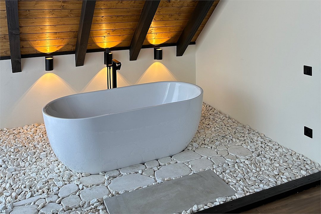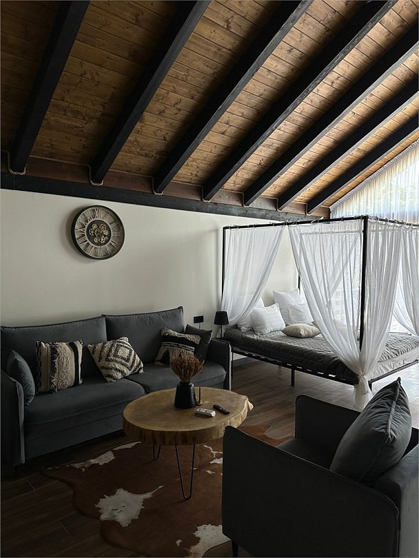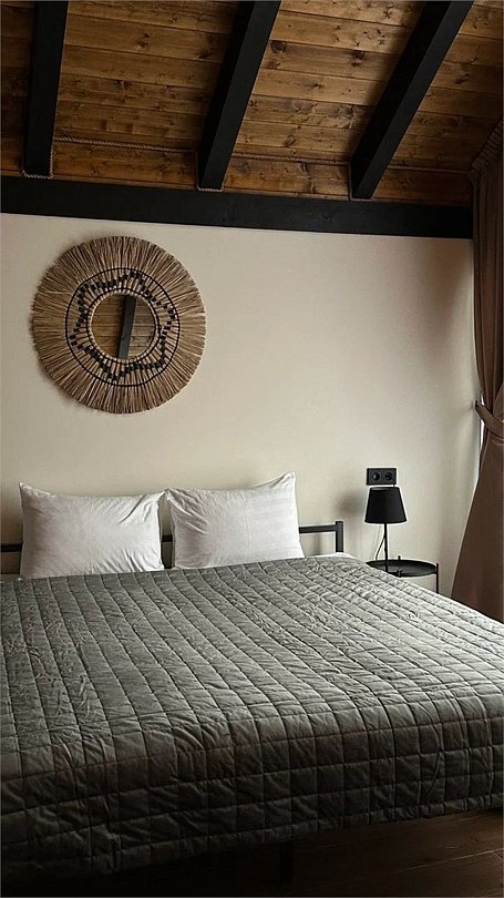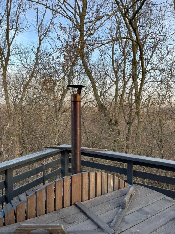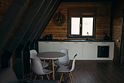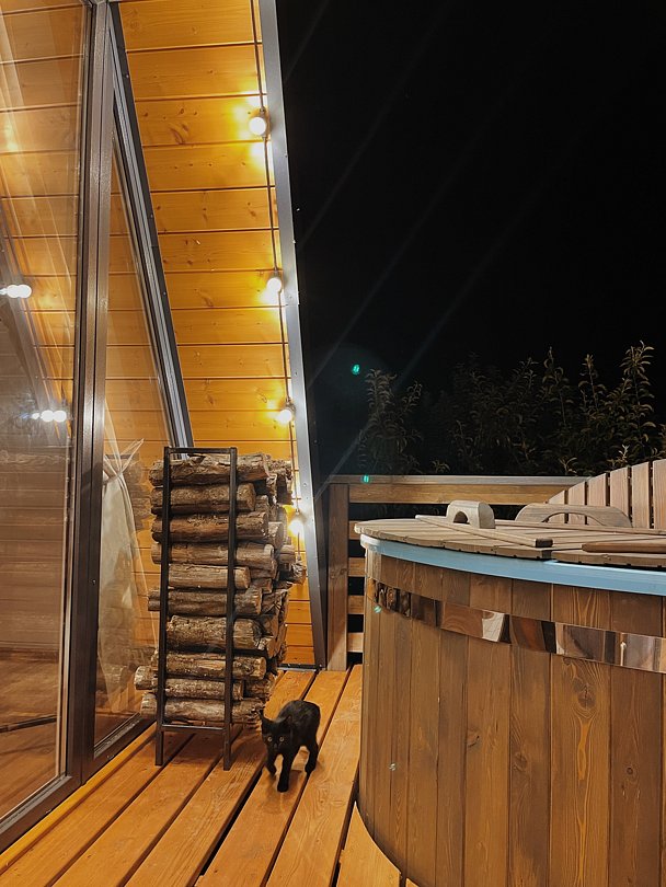 Максимальная вместимость — три человека. Вас ждут: японская бочка фурако на террасе, два шезлонга и зонт от солнца, BBQ-зона, раскладной диван, детская кроватка по запросу, двуспальная кровать, уютный камин, Wi-Fi, холодильник, чайник, капсульная кофемашина, полноценная кухня с плитой, набор посуды, приборы, бокалы.