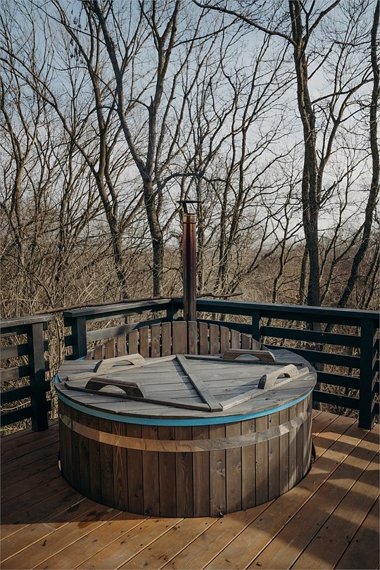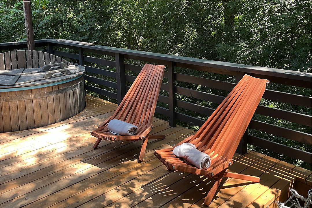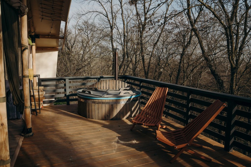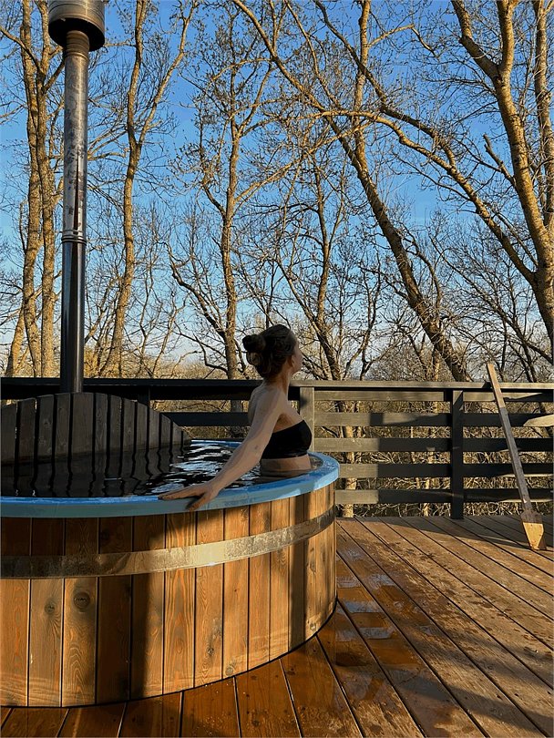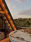 Одной из особенностей глэмпинга является индивидуальная японская бочка фурако, расположенная на террасе каждого дома. Эта уникальная услуга включает в себя подготовку и топку специалистами и позволяет дополнительно украсить процедуру цитрусами, травами, цветами или ветками пихты.