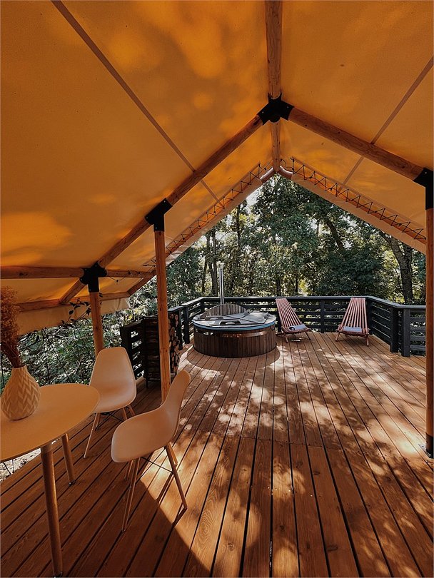 Идеальный и стильный тент для двоих! В дождливые дни у гостей этого тента есть преимущество — крыша над террасой, где вы сможете наслаждаться шумом дождя и свежестью природы. А при хорошей погоде вы можете расслабиться в собственной фурако или приготовить ужин на BBQ-зоне около домика.