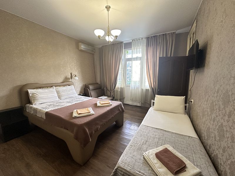 Комфортный однокомнатный номер с одной двуспальной или двумя односпальными кроватями и диваном-кроватью.