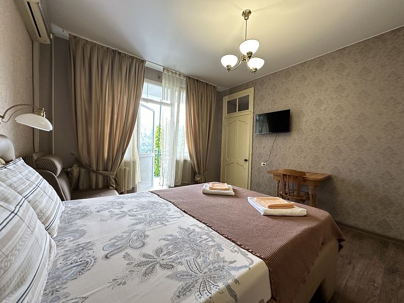 Комфортный однокомнатный номер с одной двуспальной кроватью, креслом-кроватью и балконом.