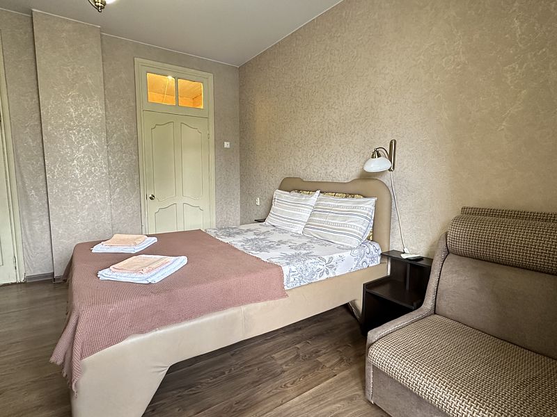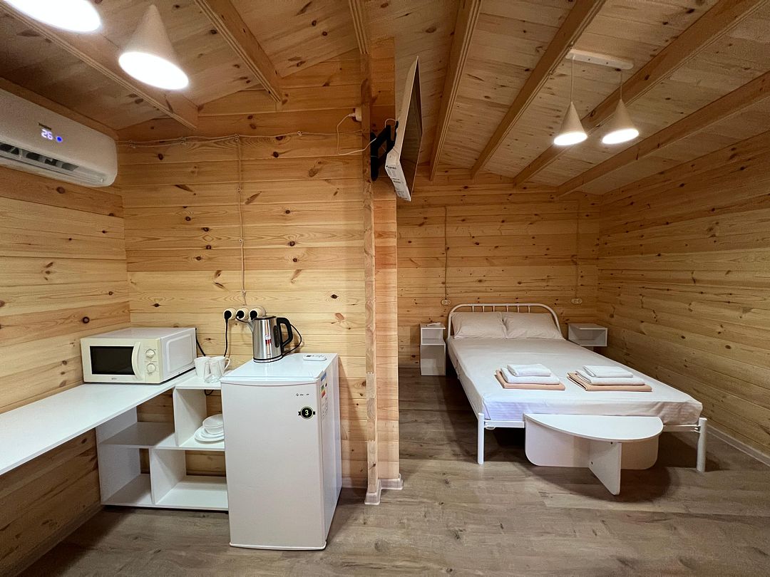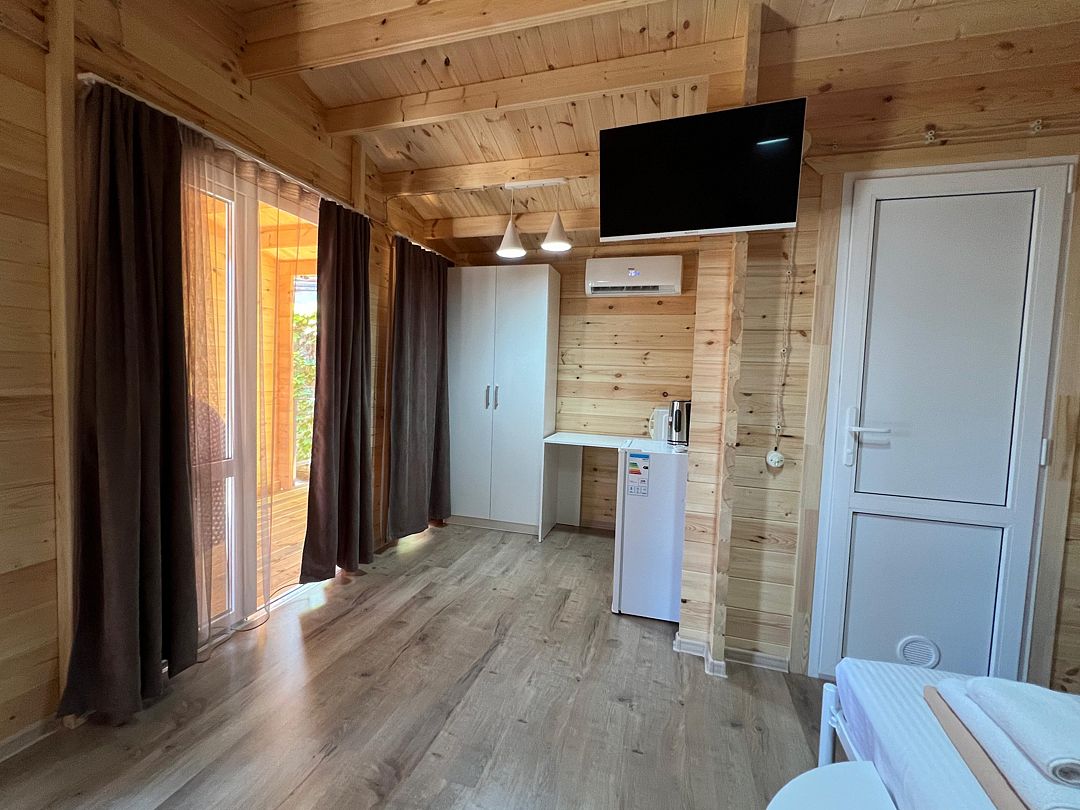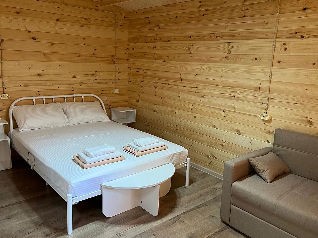Просторный однокомнатный номер с двуспальной кроватью и двухместным раскладным диваном. С отдельным входом и террасой.