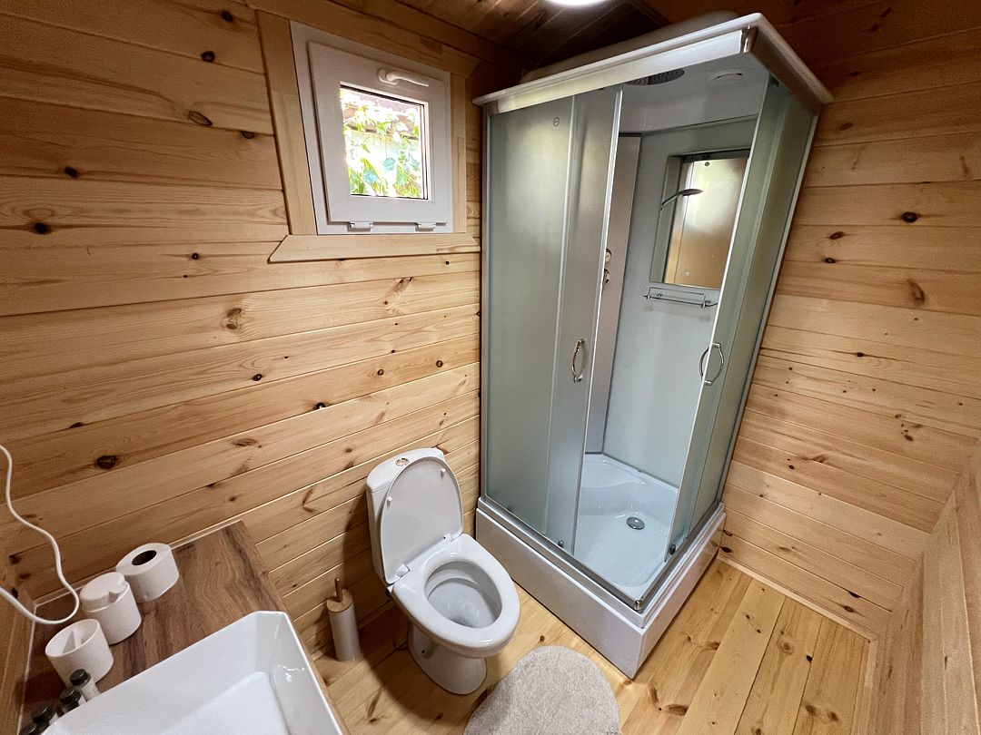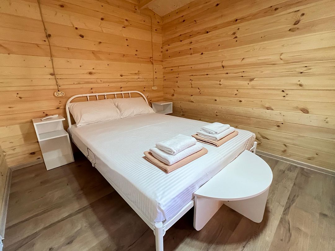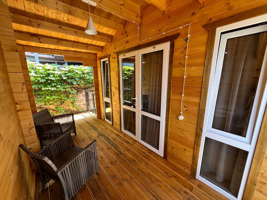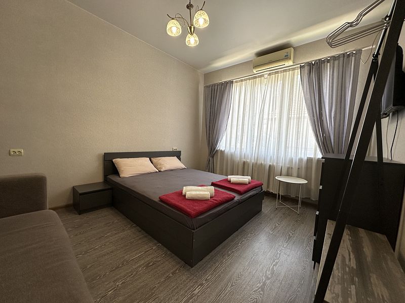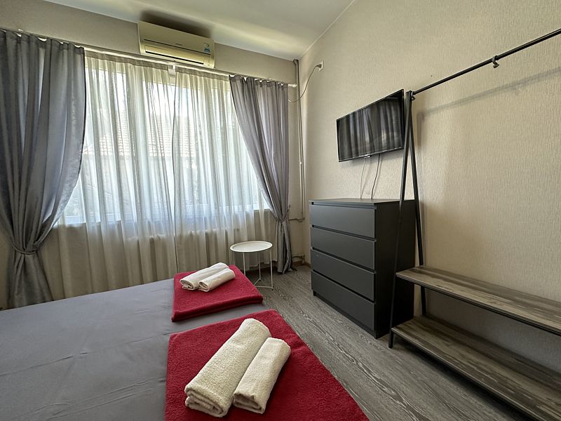 Просторный однокомнатный номер с двуспальной кроватью и двухместным раскладным диваном. С отдельным входом и террасой.