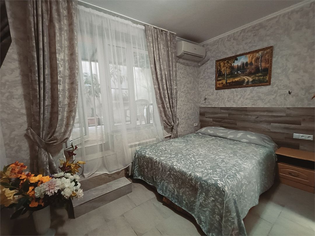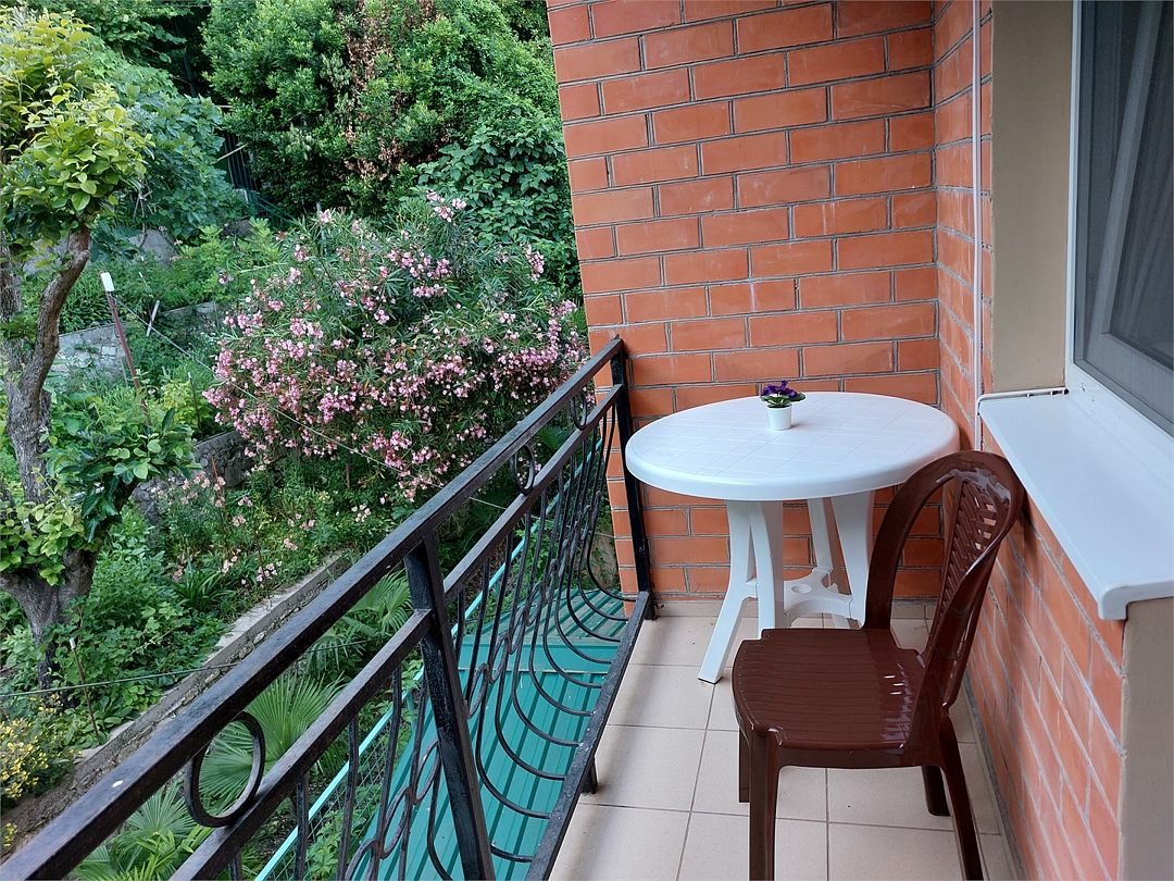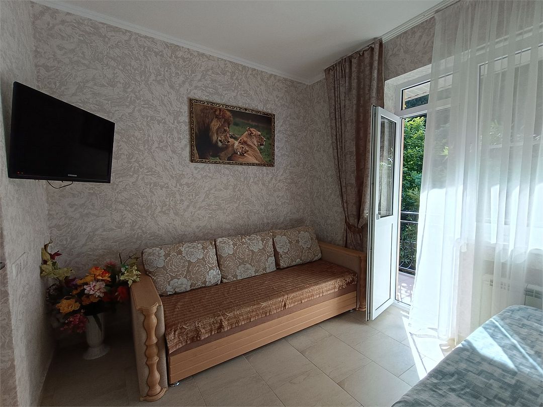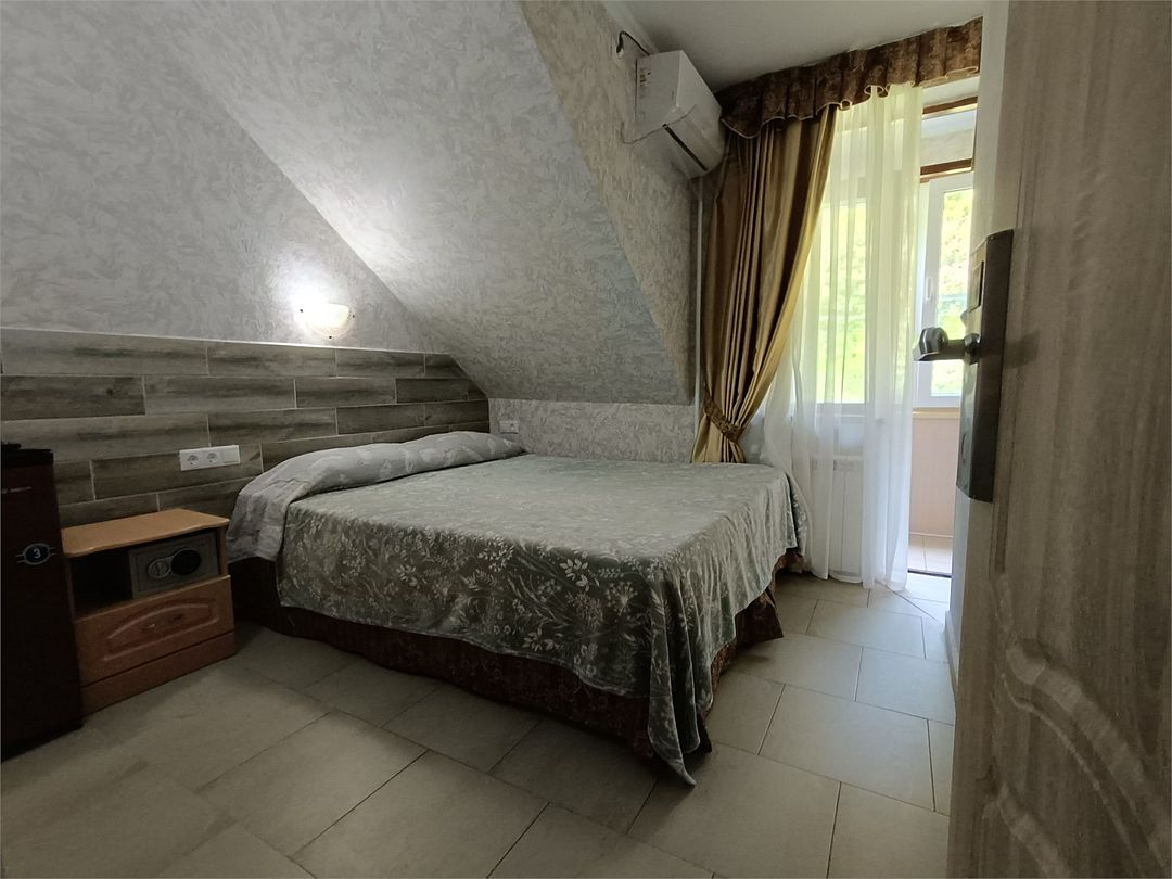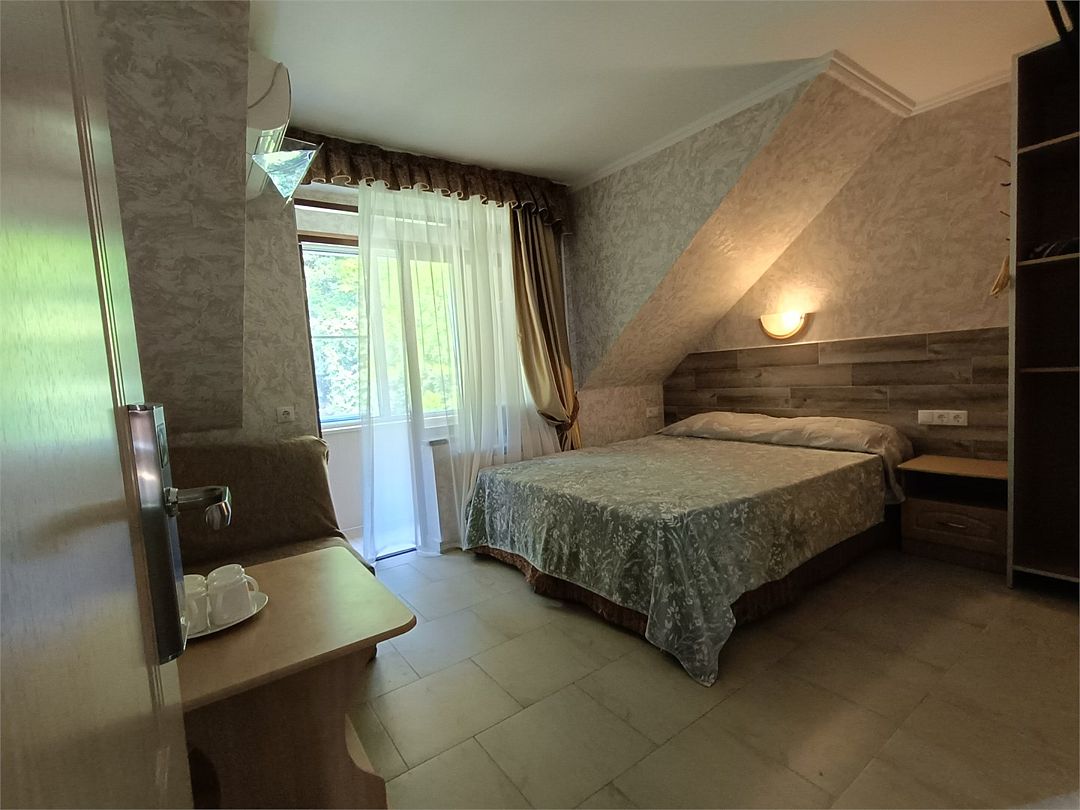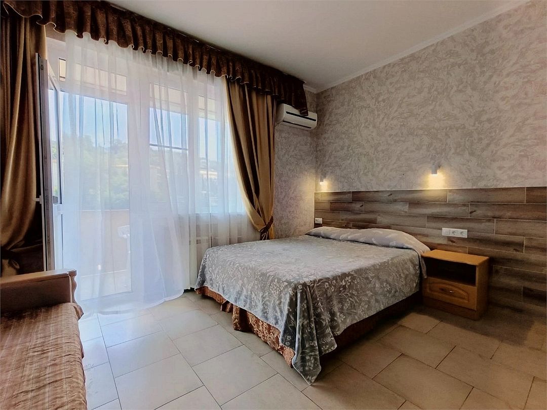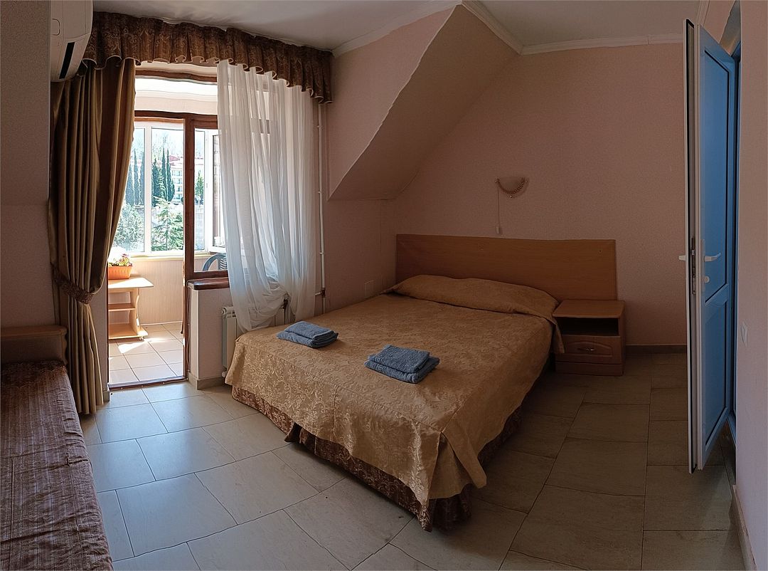 просторный и радующий своей комфортабельностью и домашним уютом номер. Здесь есть всё, чтобы Ваше пребывание было по настоящему комфортным Балкон на манеру "Французских балкончиков" - кованный метал, кофейный столик. 2 и 3 этаж - с видом на сад. Приятная прохлада и нежное пение птиц. 4, мансардный этаж - застеклённые лоджии. вид на горы и море.Услуги и удобства