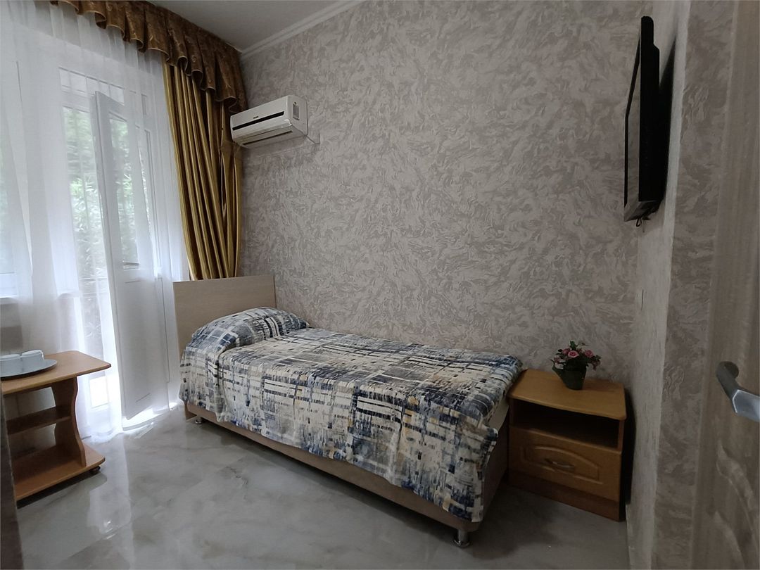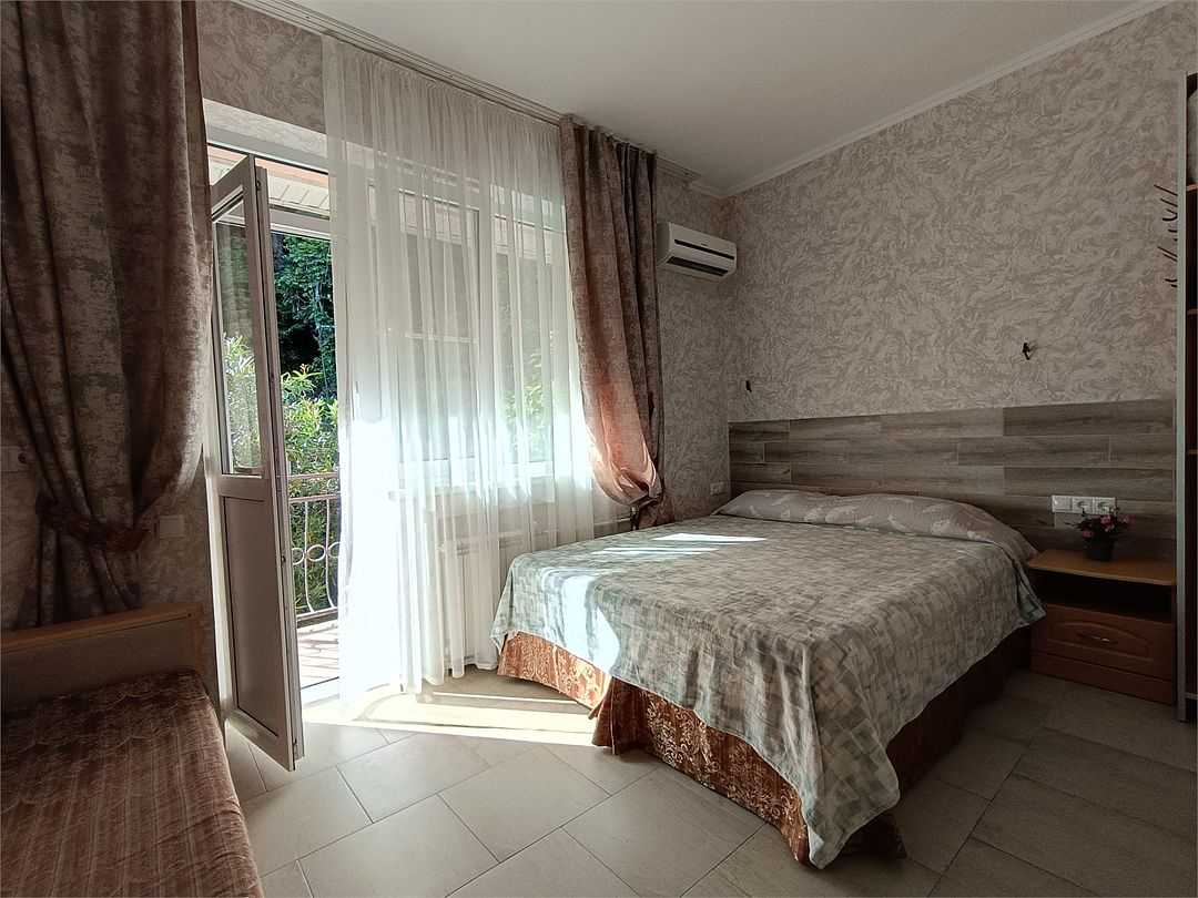 Небольшой, уютный 2х местный номер с дополнительной кроватью и балконом. Вид на сад подарит тишину и прохладу. 4 этаж, один из самых тихих номеров. невысокие ступеньки внутри здания не доставят трудностей.Услуги и удобства