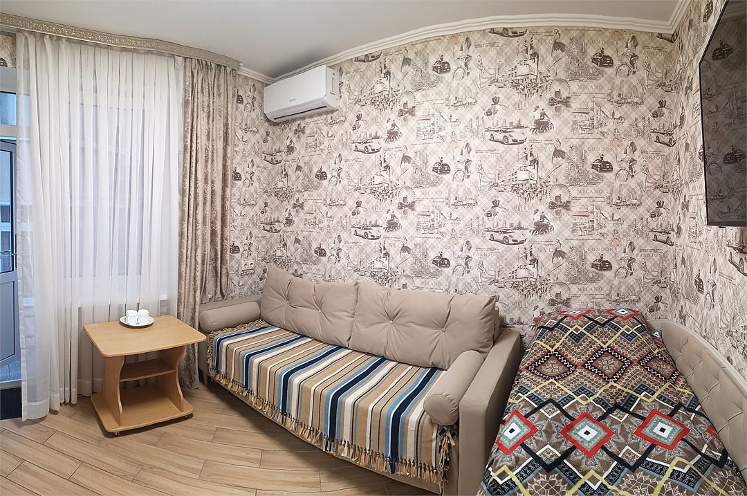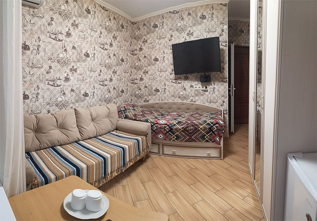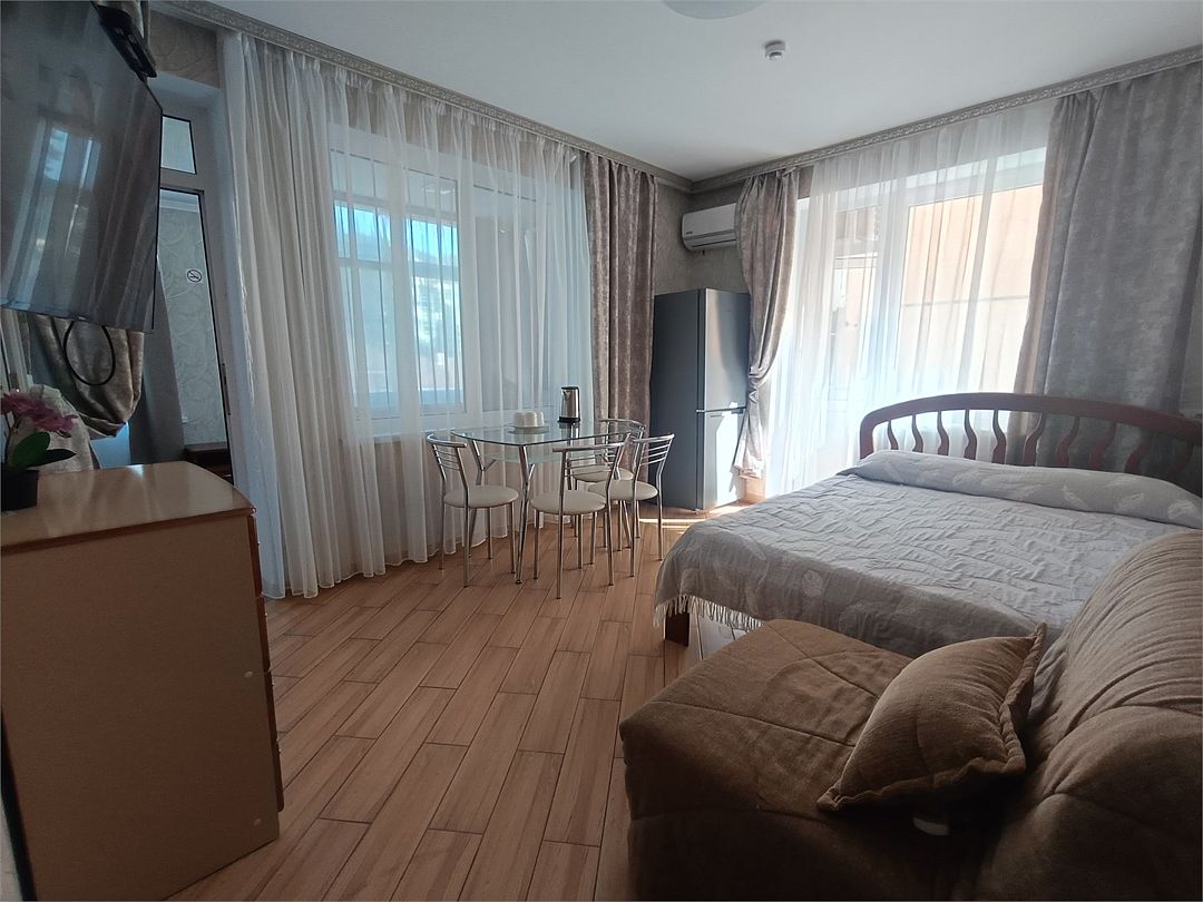 спутниковое телевидение, Wi-Fi, холодильник, кондиционер, фен, утюг, душевая кабина, теплый пол, банные полотенца, лоджия, двуспальная кровать, гладильная доска, стулья, вешалки, зеркало, две комнаты, звуконепроницаемые стены и окна, обслуживание номеров, чайник, унитаз, раковина, отопление, отдельный вход в номер, плиточное покрытие, вид во двор, стаканы, стол, туалетные средства, сушилка для белья, цифровое тв, раскладной диван, раскладное кресло, телевизор с плоским экраном, москитная сетка, гостиничная парфюмерия, общественный бассейн, онлайн-регистрация до заезда, можно с питомцамиВ гостиничном номере