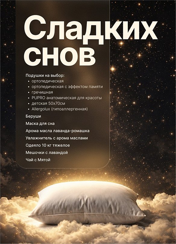 Вдохновлённый горными пейзажами и трендами биохакинга 2026 года, «Стандарт для сна» — это пространство, в котором мы превратили качество отдыха в настоящее искусство. Каждый номер этой категории оснащён расширенным меню опций сна — персональным набором инструментов для глубокого и восстанавливающего отдыха: Подушки на выбор: • Ортопедическая • Ортопедическая с эффектом памяти • Гречишная • PUPRO анатомическая для красоты • Детская 50×70 см • Allergolux (гипоаллергенная) Дополнительные опции: • Беруши • Маска для сна • Аромамасла лаванда-ромашка • Увлажнитель с аромамаслами • Утяжелённое одеяло 10 кг • Мешочки с лавандой • Чай с мятой Номера располагаются на третьем этаже второго корпуса. Большая двуспальная кровать, сплит-система, детская кроватка по запросу. Специальное предложение: Гостям категории «Стандарт для сна» предоставляется скидка на расслабляющий массаж — просто сообщите администратору номер своей комнаты. Стандарт для сна — когда отдых становится осознанным!Услуги и удобства