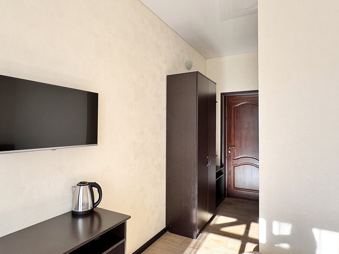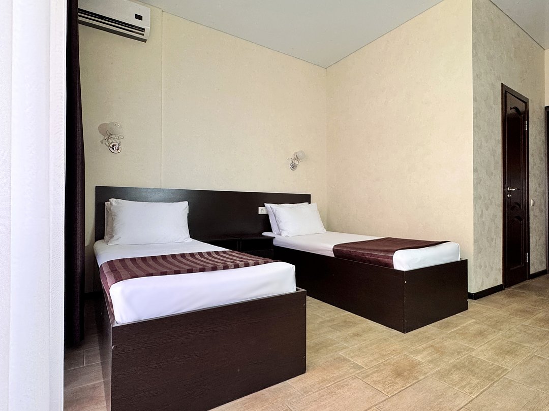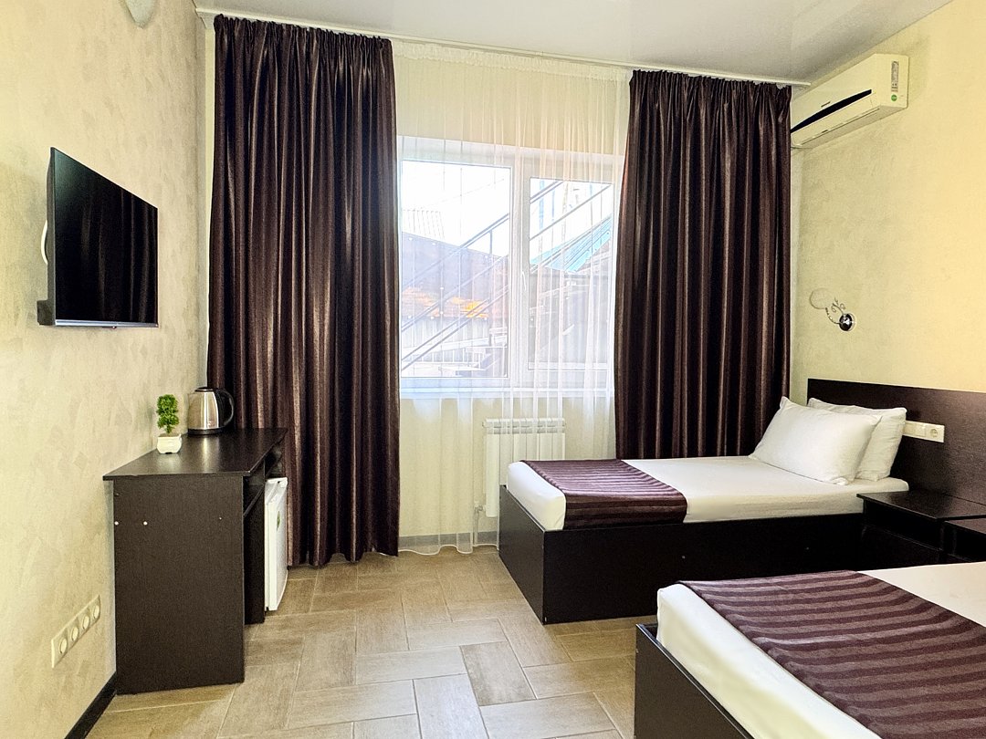 Однокомнатный номер без балкона. Номер оснащен: две односпальные кровати или двуспальная кровать, прикроватные тумбочки, прикроватные бра, туалетный столик, шкаф, вешалка, зеркало, электрический чайник, мини-холодильник, телевизор, кондиционер, шторы блэк-аут. Ванная комната: душ, зеркало, фен, комплект полотенец, тапочки, набор гостиничной косметики.
