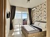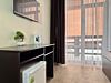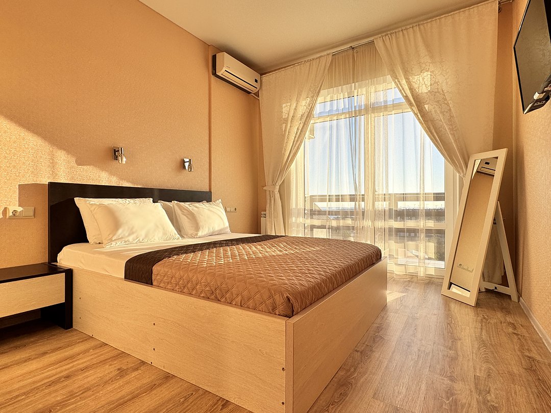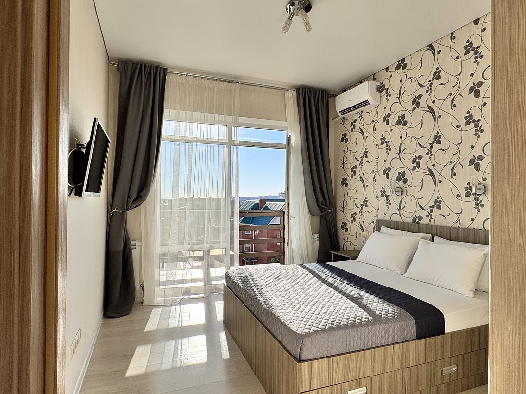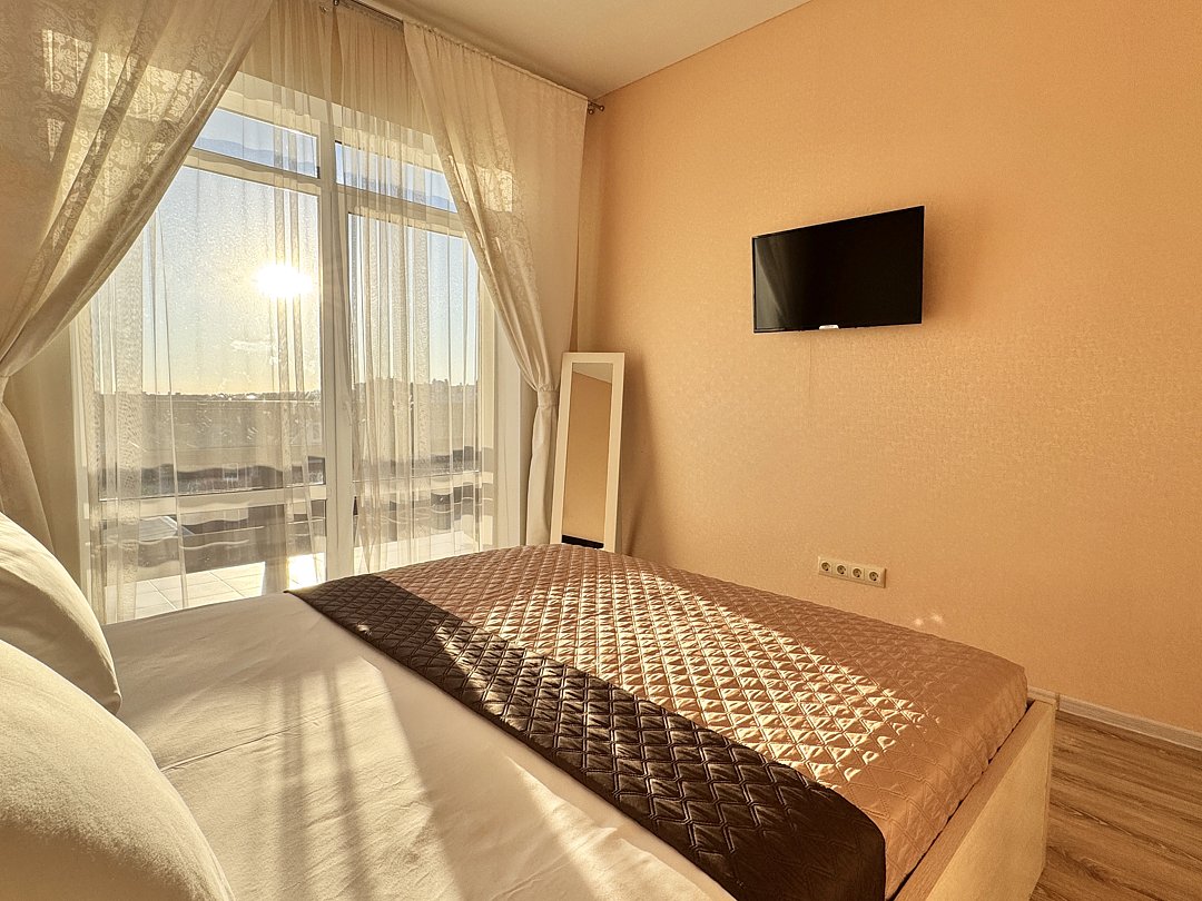 Спальня: двуспальная кровать, с ящиками для хранения вещей, прикроватные тумбочки, светильники-бра над кроватью, розетки возле кроватей; телевизор, кондиционер, шторы блэк-аут. Балкон.